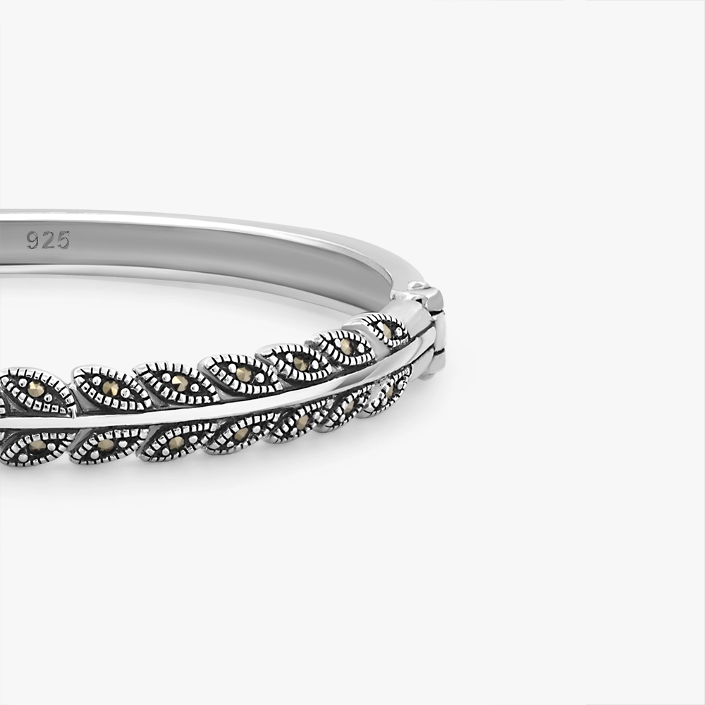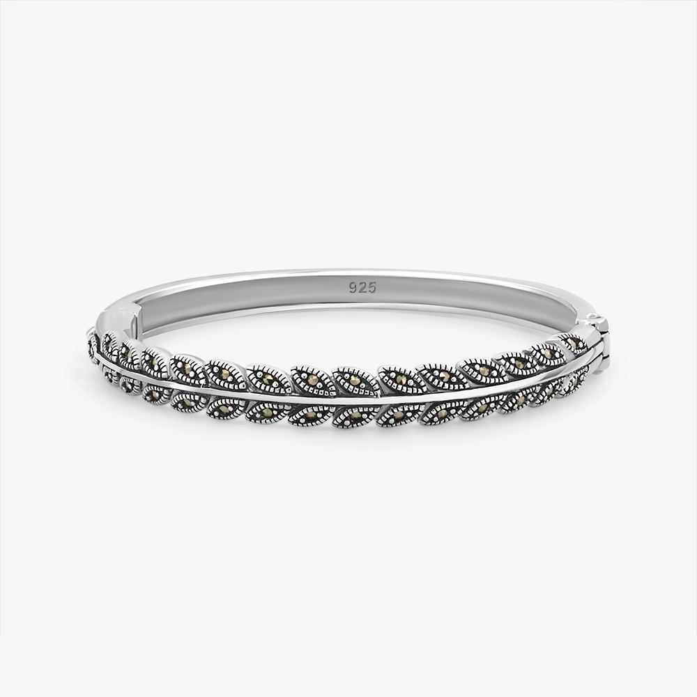 أسوارة فضة 925 بتصميم ماركازيت مرصعة بأحجار بايرايت مستوحاة من شكل الأوراق. تتميّز بتفاصيل دقيقة وطابع عتيق، وتأتي مع قفل صندوقي محكم، ومتوفّرة بعدة مقاسات.