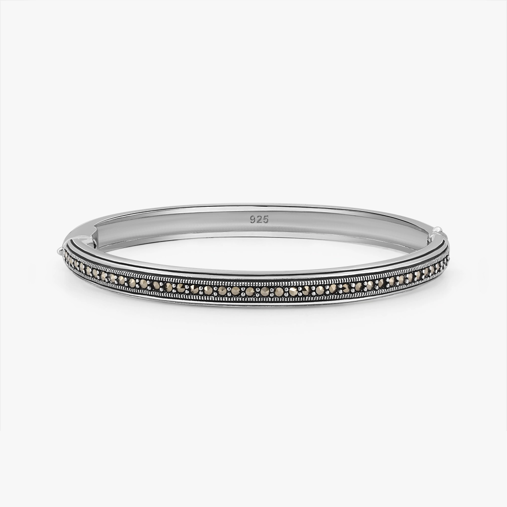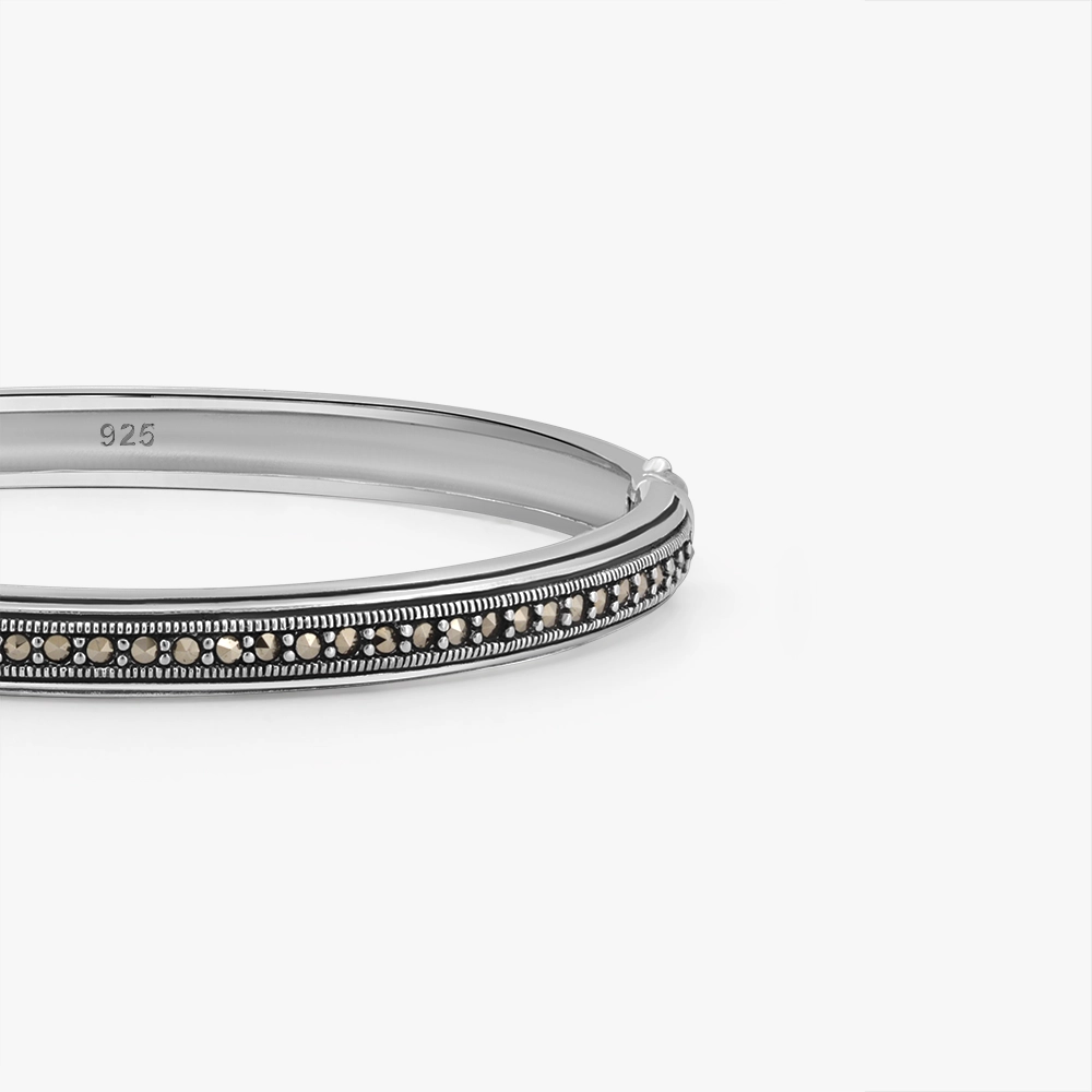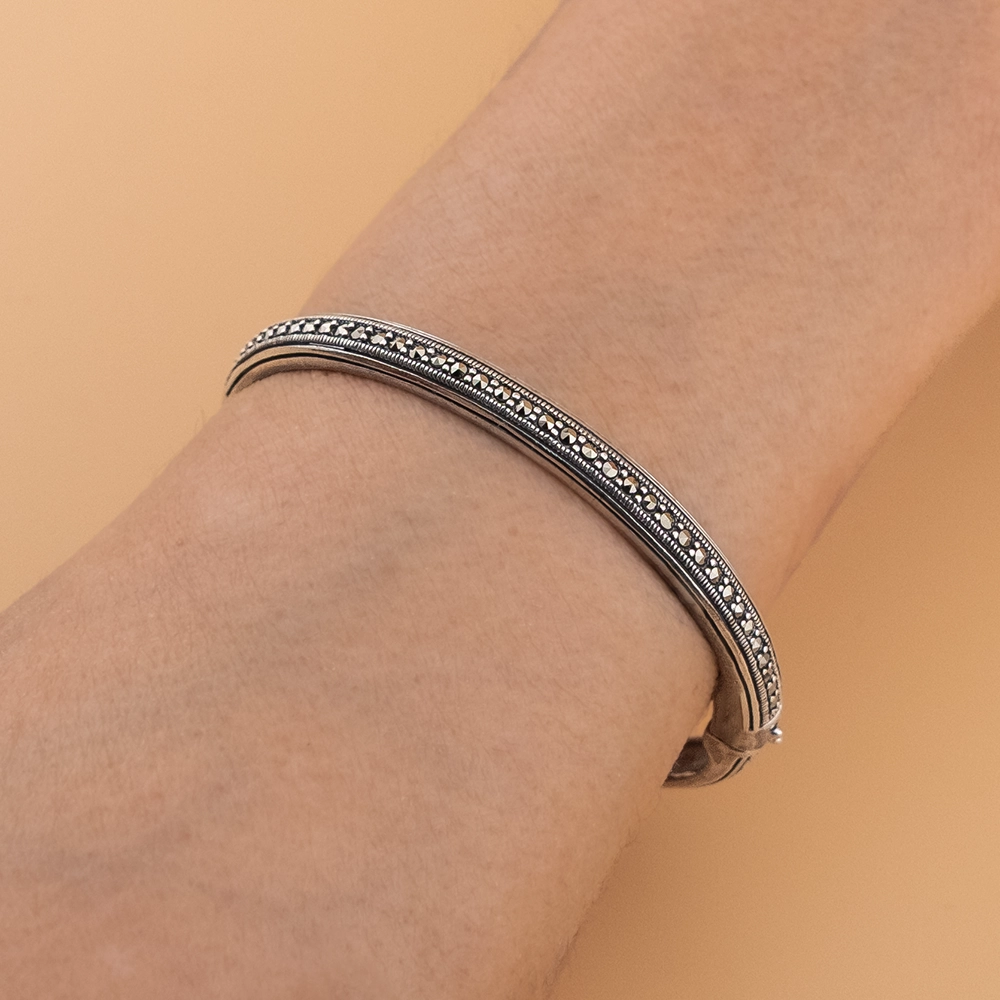 أسوارة فضة بتصميم بسيط من موديل الماركازيت مما تمنحها وأناقة كلاسيكية. تأتي بعرض 5.7 ملم، مزوّدة بقفل صندوقي محكم ومتوفّرة بعدة مقاسات لتناسب مختلف الأيدي.