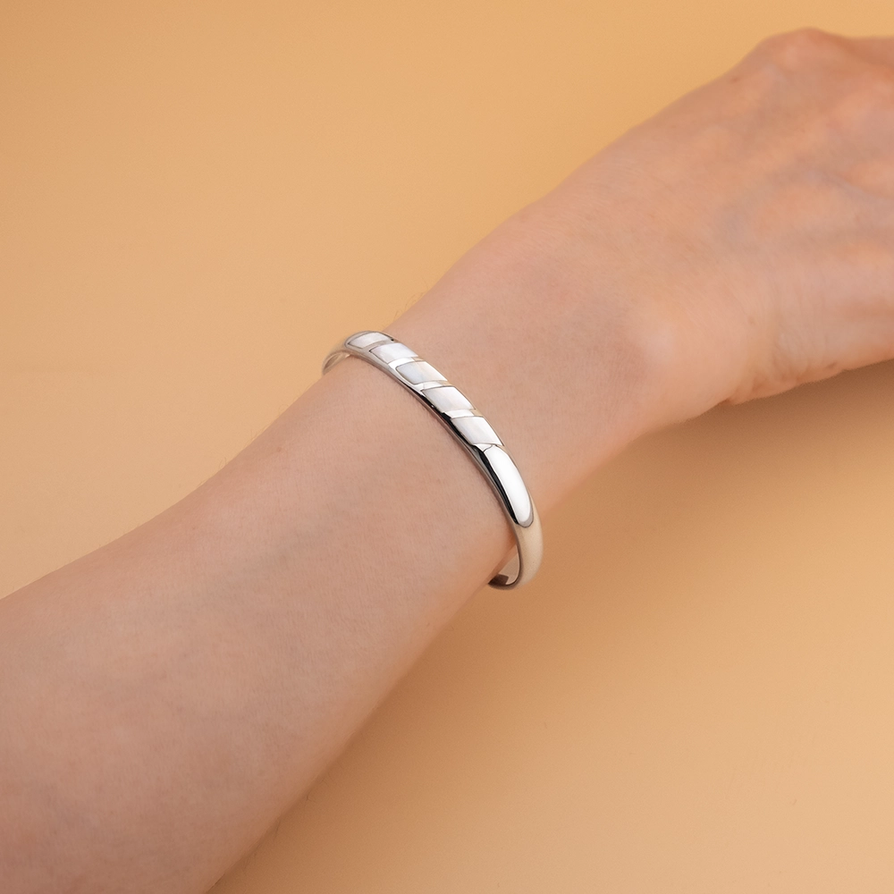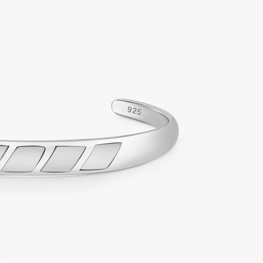أسوارة فضة عيار 925 واقفة مفتوحة مزخرفة بعرق اللؤلؤ بتدرجات اللون الأبيض. تصميم بسيط يعكس جمال الطبيعة ولمسة من الأناقة العصرية.