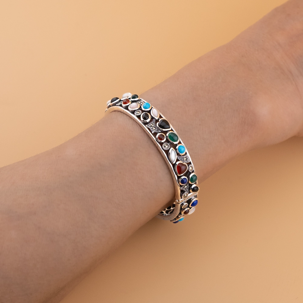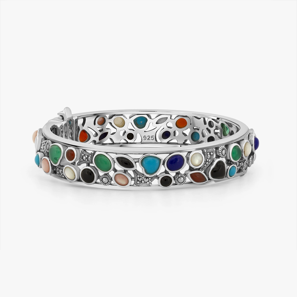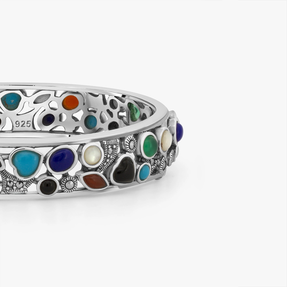 أسوارة فضة عيار 925 بتصميم ماركازيت مرصعة بأحجار طبيعية متعددة الألوان تشمل الكالسيدون والصدف، بعرض 11.5 ملم وقطر داخلي 5.4 سم.