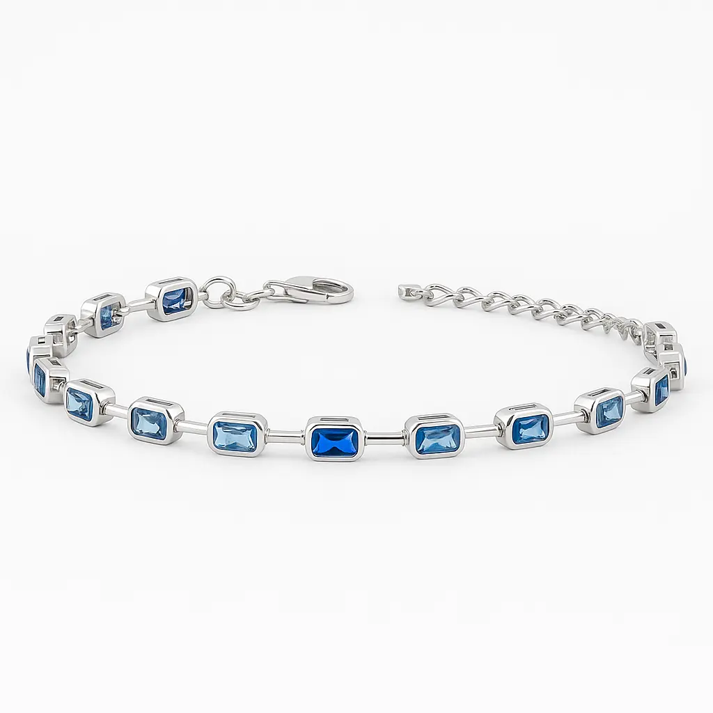 أسوارة فضة 925 مرصّعة بأحجار زركون مستطيلة الشكل تتدرج ألوانها عشوئيا بدرجات اللون الأزرق. تأتي قفل مصك من الفضة مزوّدة بتوصيلة بطول 3 سم لتناسب مختلف المقاسات.