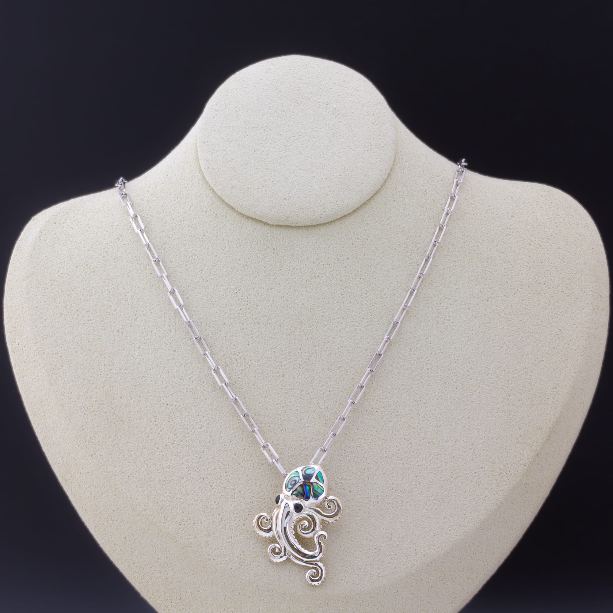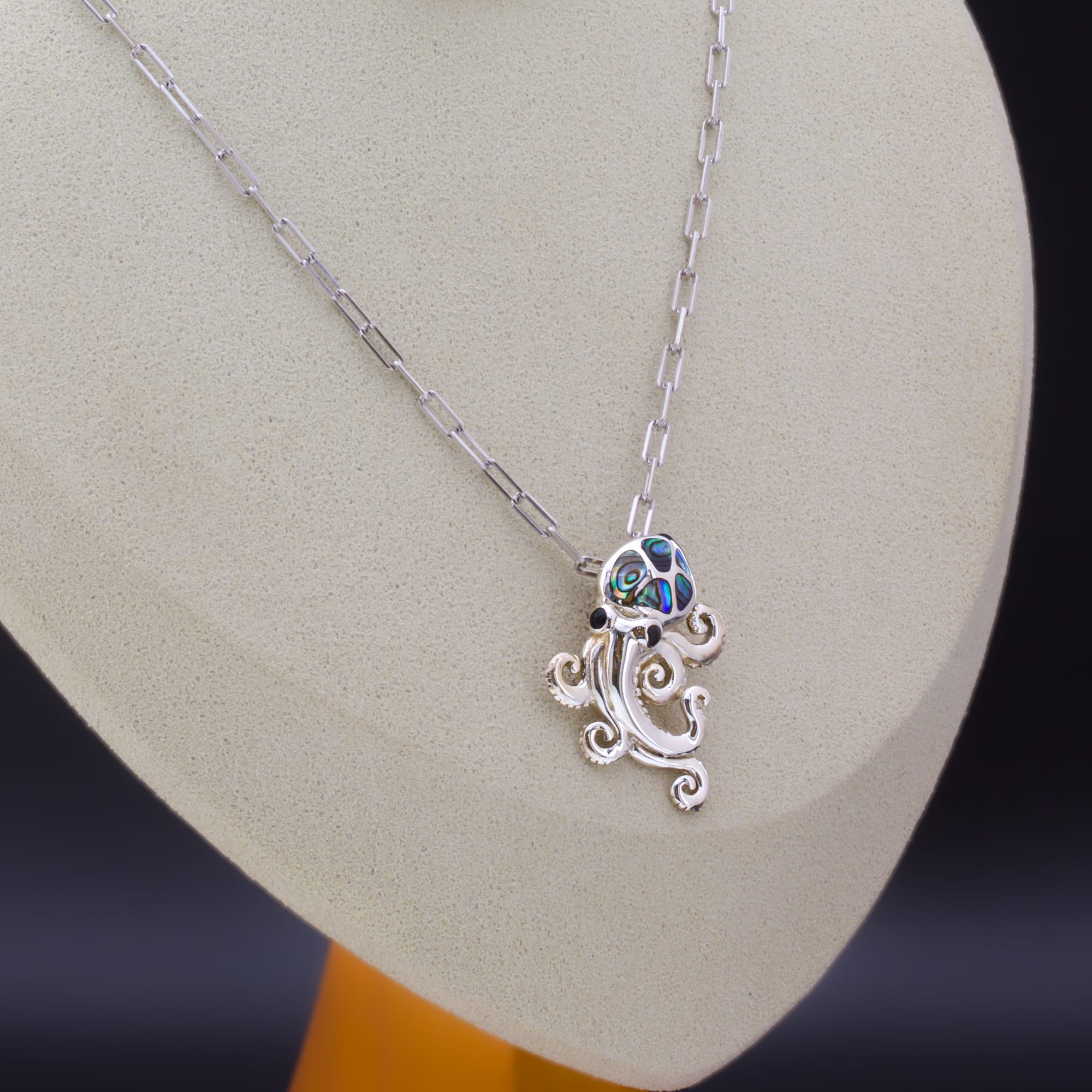عقد فضة إسترلينية عيار 925 مع تعليقة أخطبوط مزخرفة بلمسات من حجر الأبالون الطبيعي بألوانه المتلألئة. تصميم فريد يجمع بين العصرية والتميّز.