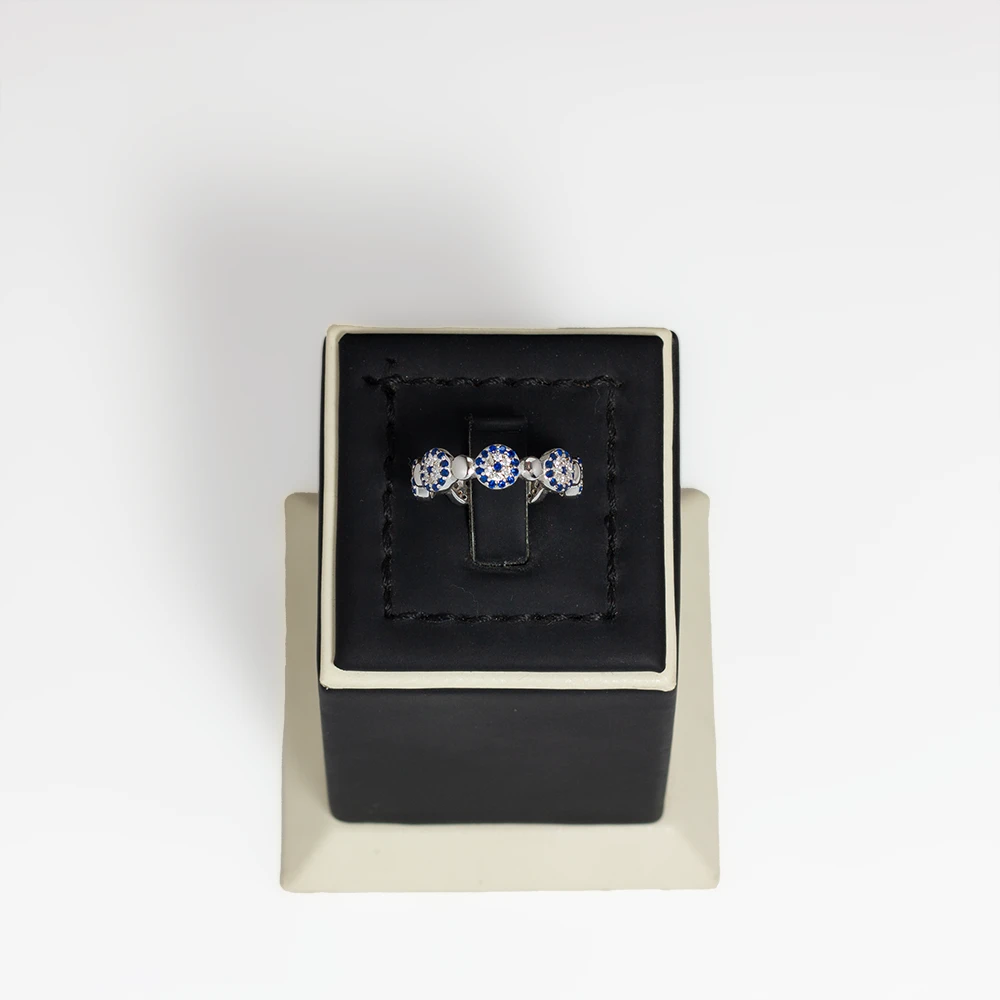 خاتم فضة بتصميم مستوحى من رمز العين الحسد، يتكون من وحدات متكررة مرصعة بأحجار زركون باللونين الأزرق والأبيض بتوزيع متوازن.