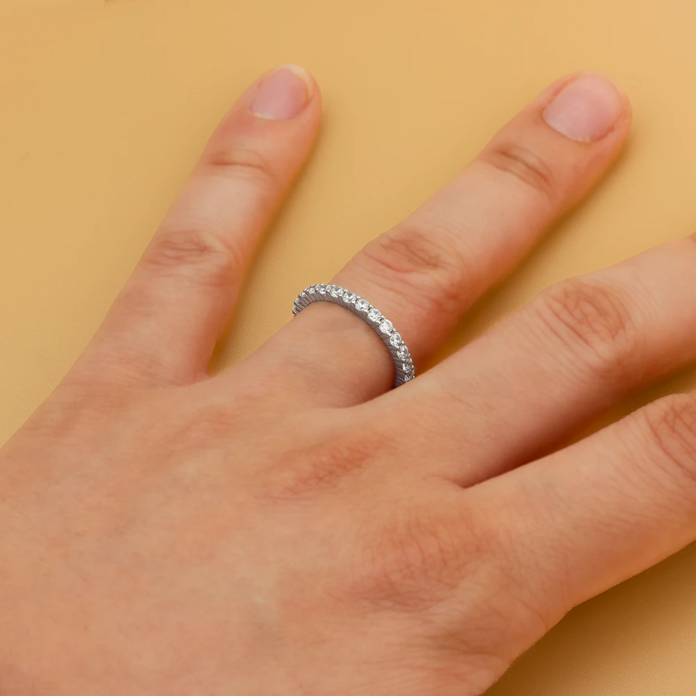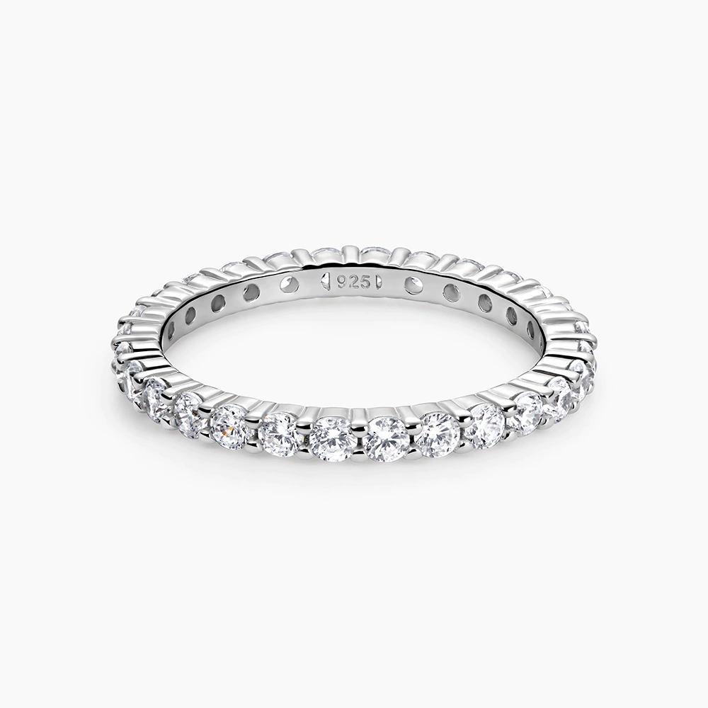 خاتم فضة بتصميم الاتيرنيتي الكلاسيكي مرصع بأحجار دائرية متساوية الحجم مثبتة حول كامل محيط الخاتم.