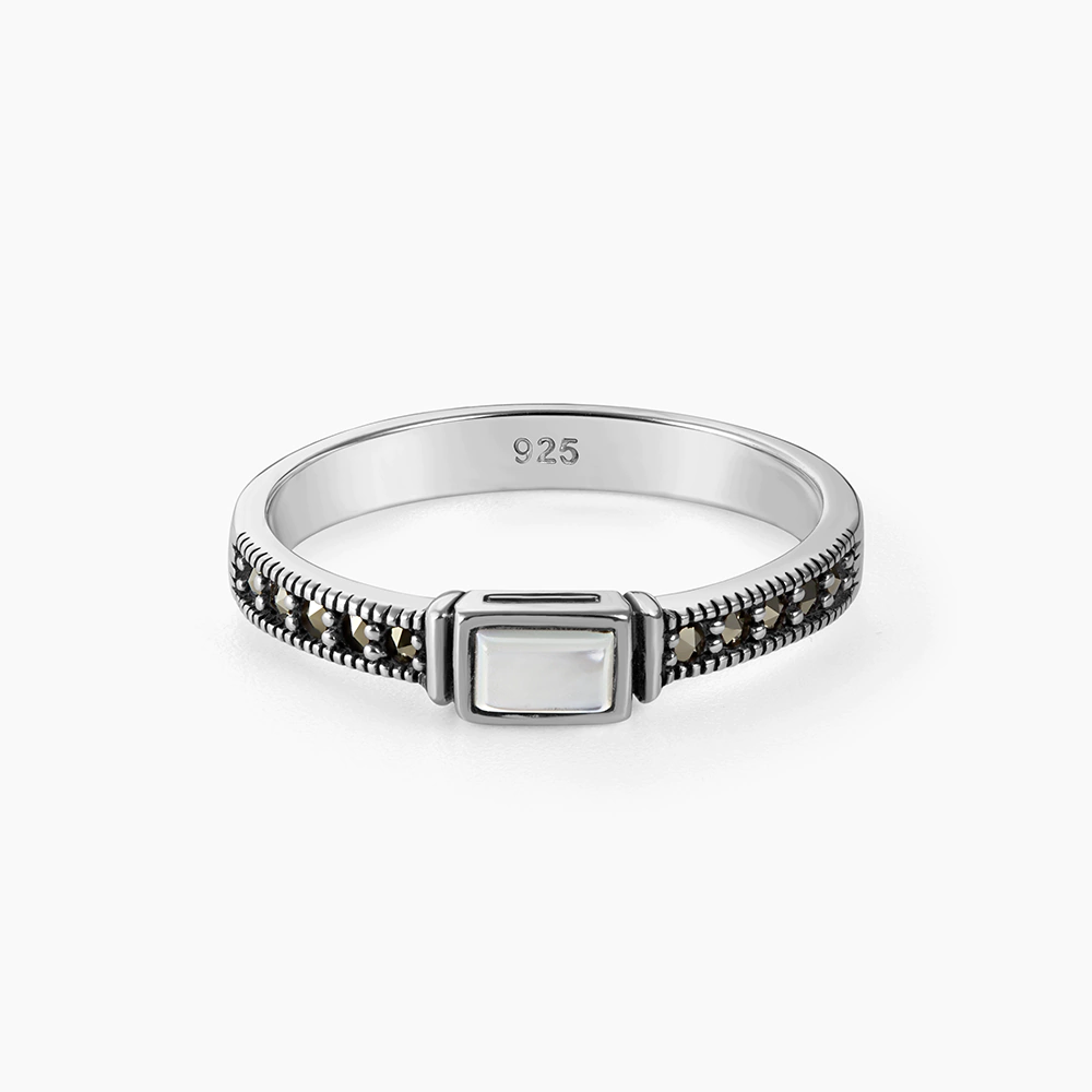 خاتم فضة بتصميم الماركازيت رفيع يتوسطه بصدفة بيضاء مستطيلة محاطة بإطار، مع ترصيع على جانبي الخاتم وحواف مزخرفة بخط محبب.