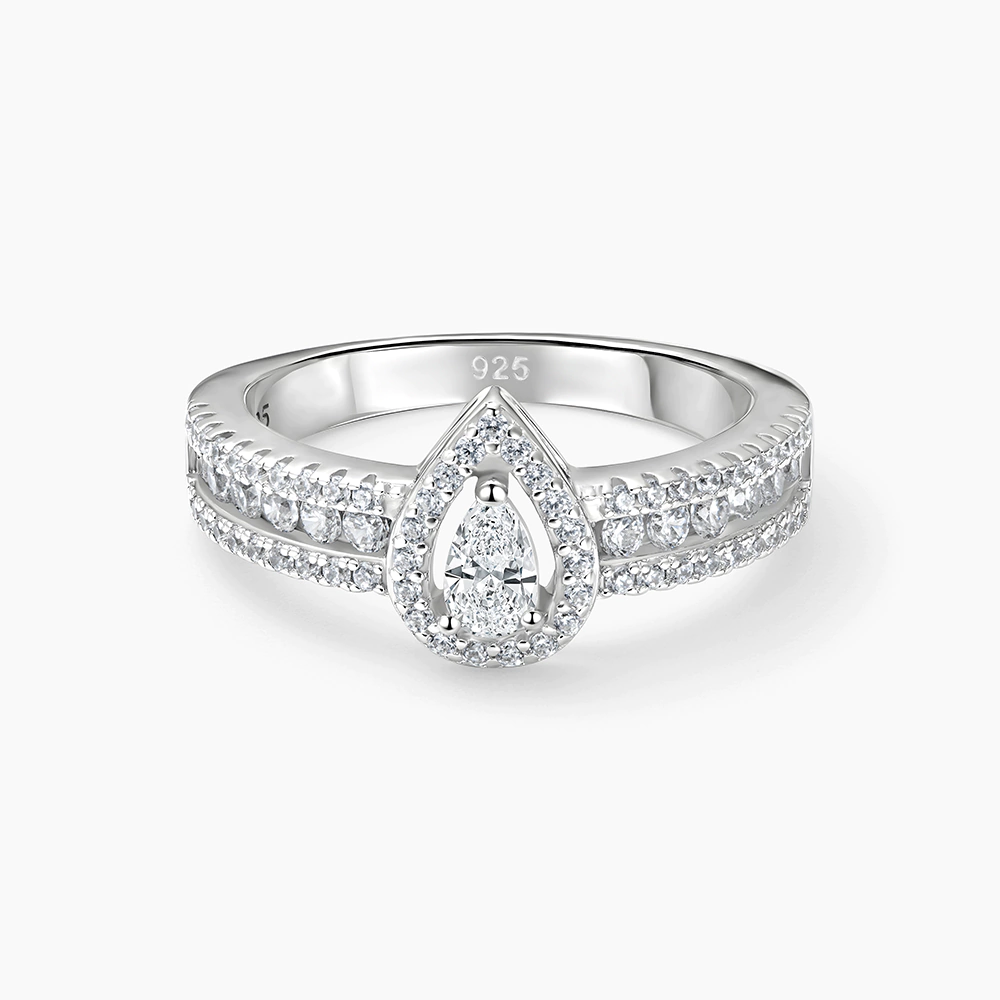 خاتم فضة يتوسطه حجر زركون دمعة محاط بطبقة من أحجار صغيرة بتصميم الهالو، مع ترصيع ممتد على جانبي الخاتم بأسلوب متناسق يظهر عمق التصميم وكثافة اللمعان على الواجهة.