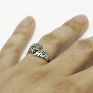 خاتم فضة الماركازيت بتصميم الزهرة والقمح حيث يرمزال إلى الجمال والخصوبة، الخاتم مرصع بأحجار البايرايت ونقش مؤكسد، موديل الخاتم تمنح القطعة مظهرًا أنيقًا.