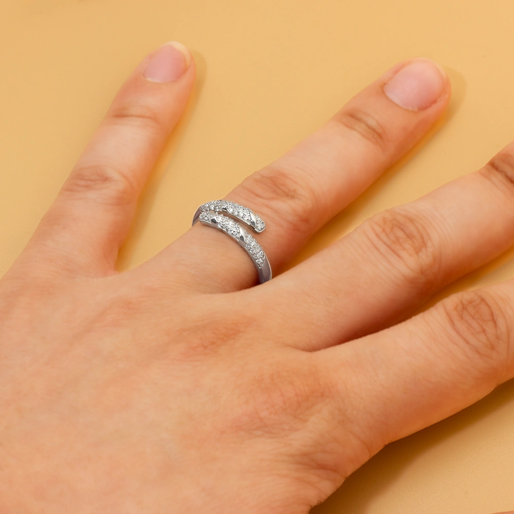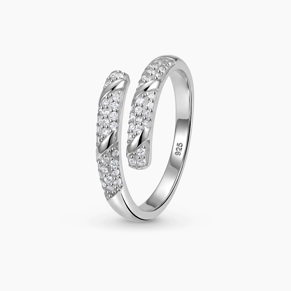 خاتم فضة بتصميم مفتوح ملتف يلتقي طرفاه بشكل متوازن، مرصّع بأحجار زركون شفافة موزعة على واجهتين مع تفاصيل ملساء تتخلل الترصيع، ليعطي مظهراً عصرياً.