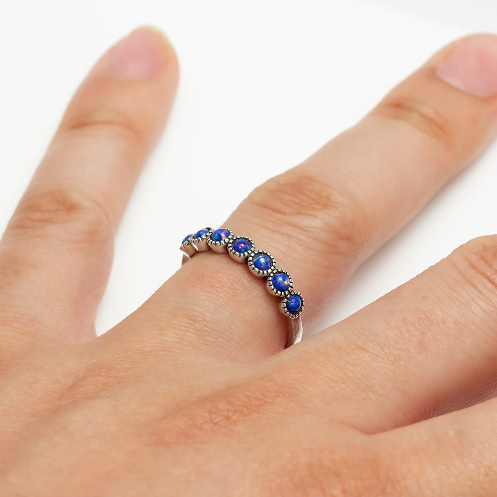 خاتم فضة 925 بتصميم  هالف اتيرنيتي يتوسطه سبعة من أحجار الأوبال السنثتك مثبتة داخل إطارات مزخرفة بتفاصيل مؤكسدة.