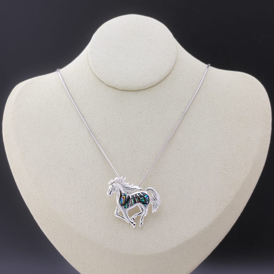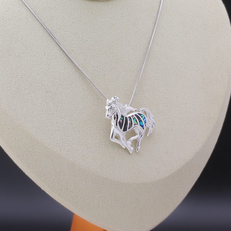 قلادة قضة بسلسلة تتدلى منها تعليقة بشكل حصان يجسد الحركة والانطلاق، مزينة بالصدف الطبيعي ليضفي لمسة جريئة. تصميم مميز يجمع بين القوة والجمال لمحبي الخيول.