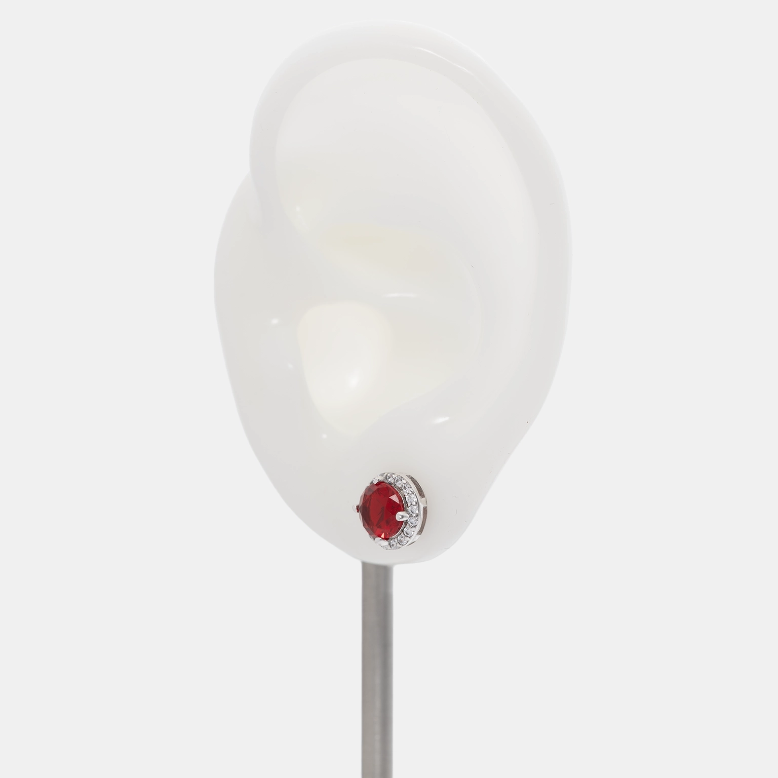 زوج حلق فضة دائري باللون أحمر من فضة إسترلينية 925 بتشطيب روديوم، يتوسطه حجر زركون دائري أحمر مع إطار هالو من زركون شفاف