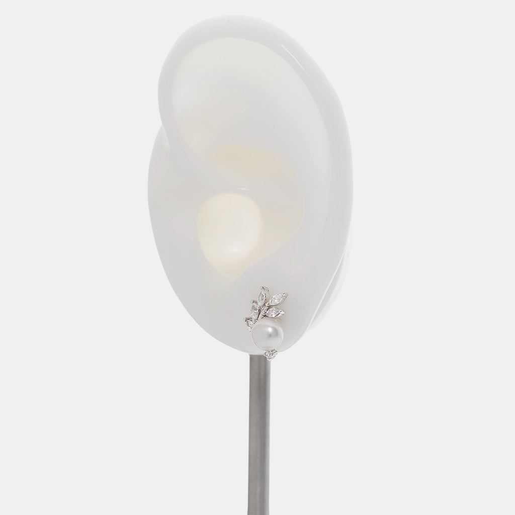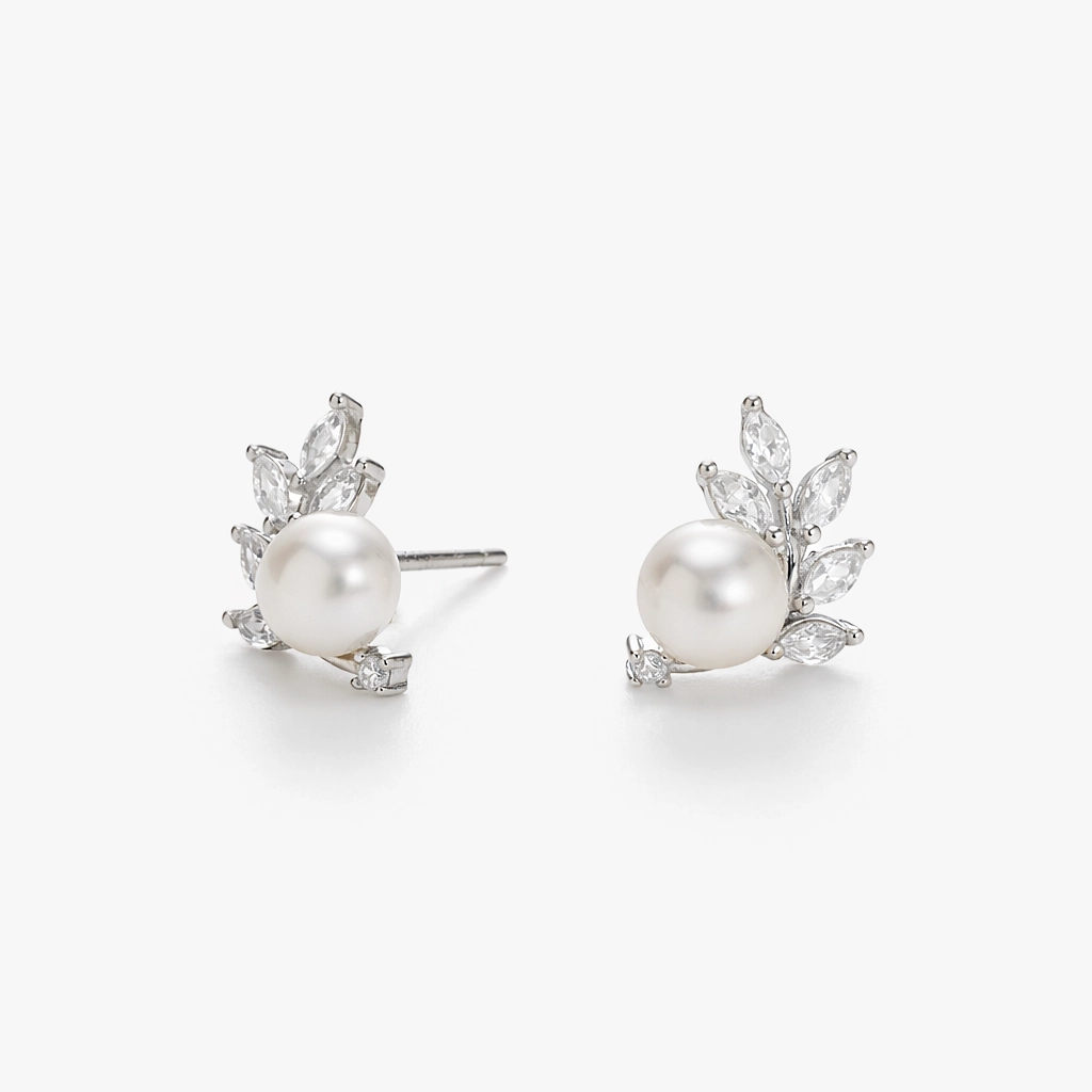 يأتي زوج حلق الفضة الستد هذا بتصميم مستوحى من ورق الشجر، مع لؤلؤ زراعي طبيعي أبيض بشكل دائري وزركون شفاف ماركيز ودائري على هيكل فضة 925.