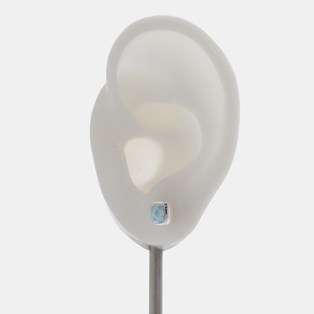 حلق فضة ستد بحجر اللاريمار طبيعي بلون سماوي، تصميم مربع صغير بإطار فضي مصقول يبرز شكل الحجر.