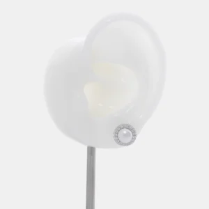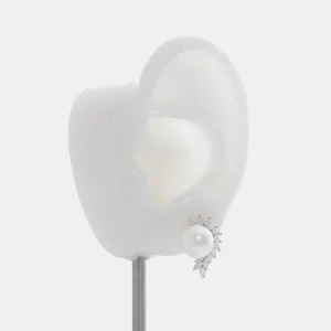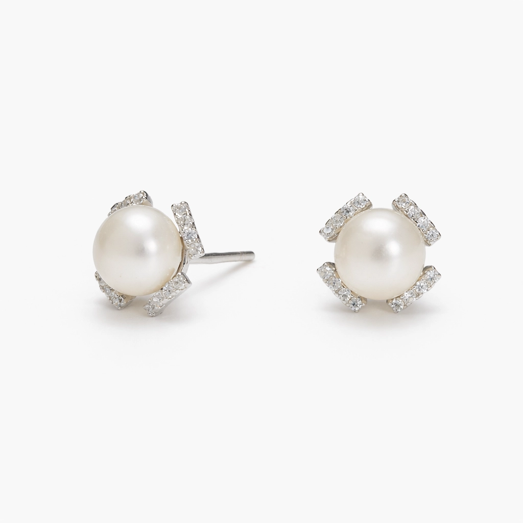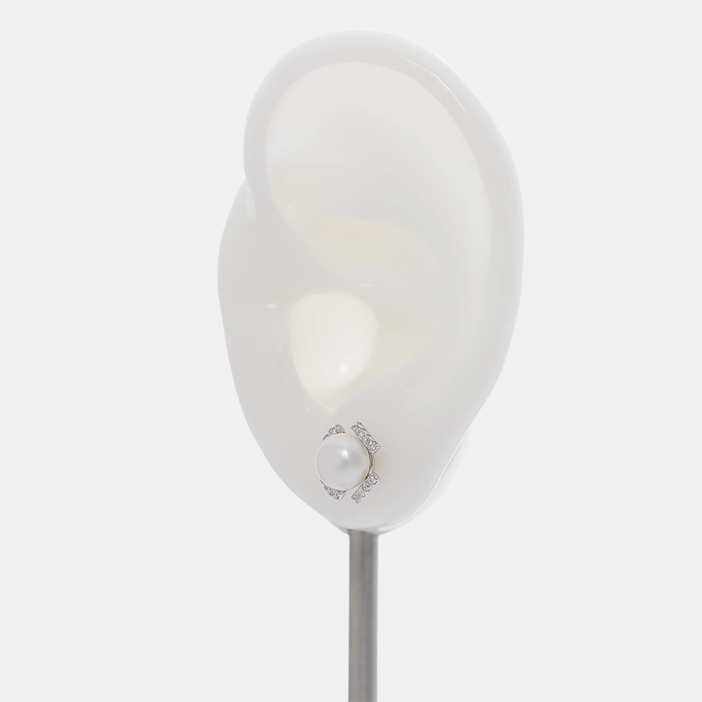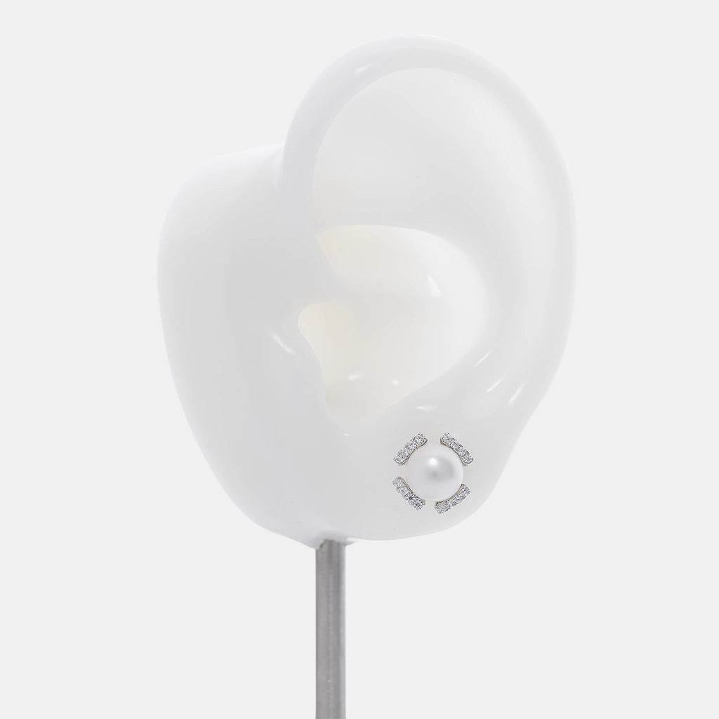 حلق فضة لؤلؤ ستد بتصميم دائري ناعم مناسب للبس اليومي، مصنوع من فضة إسترلينية عيار 925، مزين بلؤلؤ أبيض دائري تحيط به وحدات زركون شفاف.