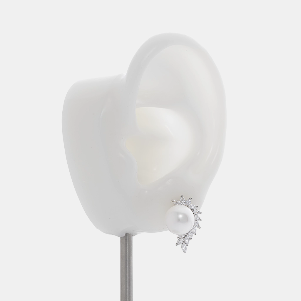 حلق فضة لؤلؤ هالف هالو ماركيز بتصميم يبرز لؤلؤاً زراعياً طبيعياً أبيض دائرياً، محاطاً بنصف هالة من زركون شفاف ماركيز بتثبيت شنكار وقفل دفع.
