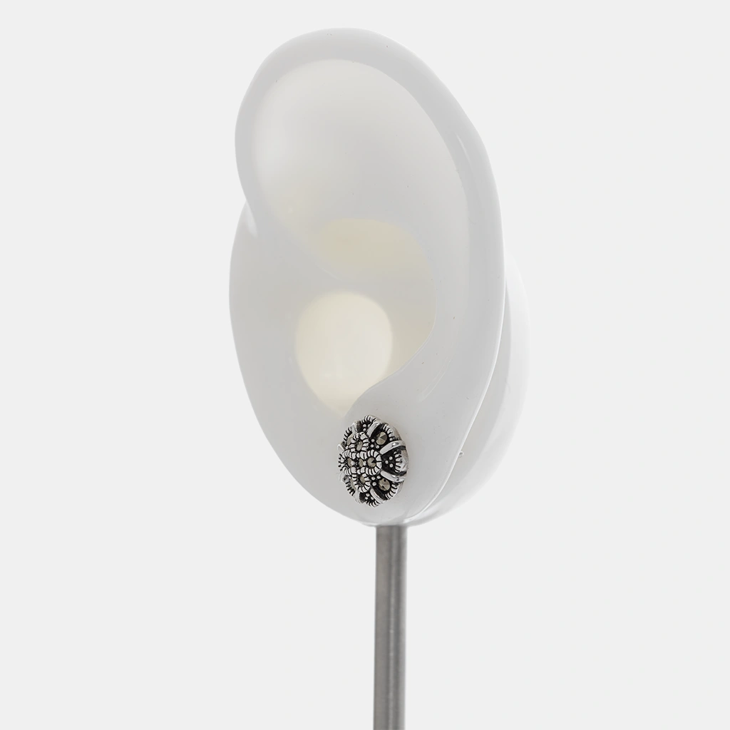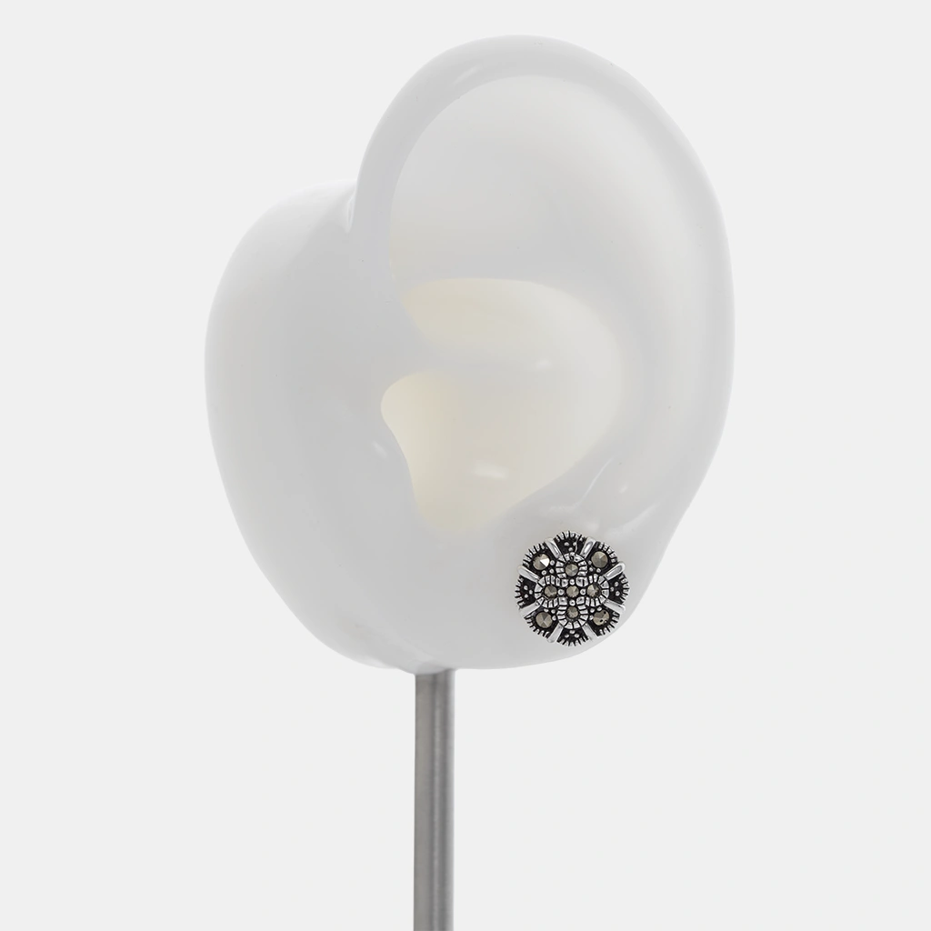 زوج حلق فضة ماركازيت دائري مزخرف من فضة إسترلينية 925 بتشطيب مأكسد، تصميم ستد ناعم بأحجار البايرايت رمادي مع قفل دفع فراشة.