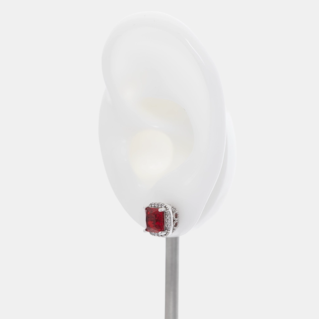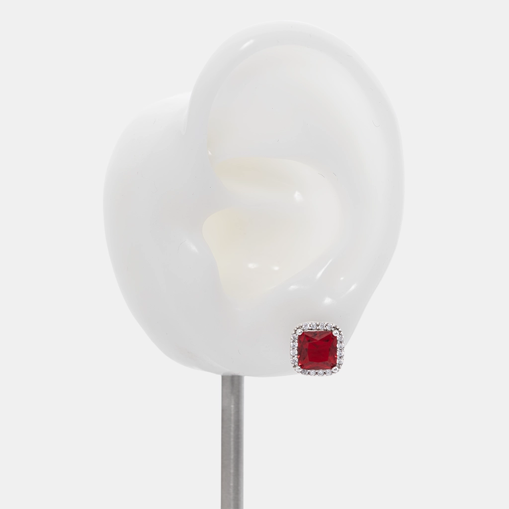 زوج حلق فضة مربع باللون الأحمر من فضة إسترلينية 925 بتشطيب روديوم، يتوسطه حجر زركون مربع أحمر مع إطار هالو من زركون شفاف