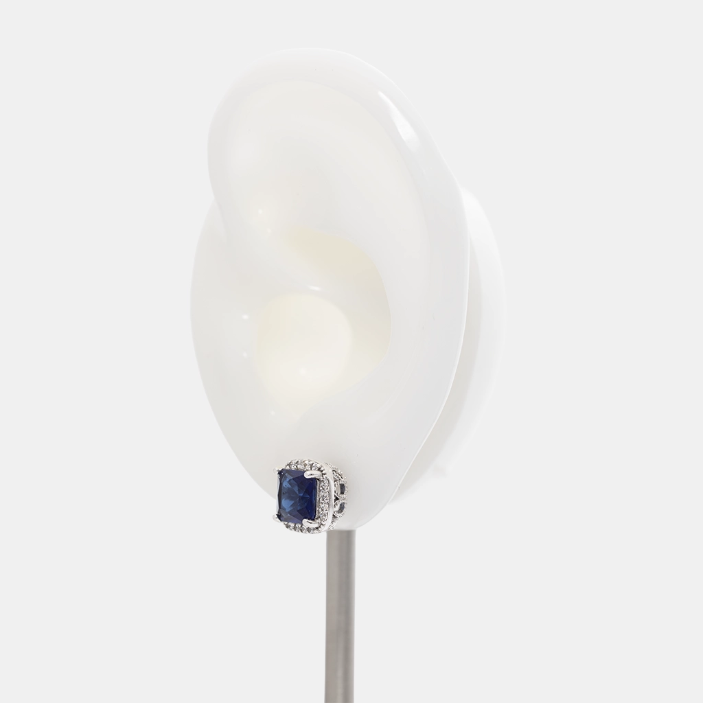 زوج حلق فضة مربع باللون الأزرق من فضة إسترلينية 925 بتشطيب روديوم، يتوسطه حجر زركون مربع أزرق مع إطار هالو من زركون شفاف