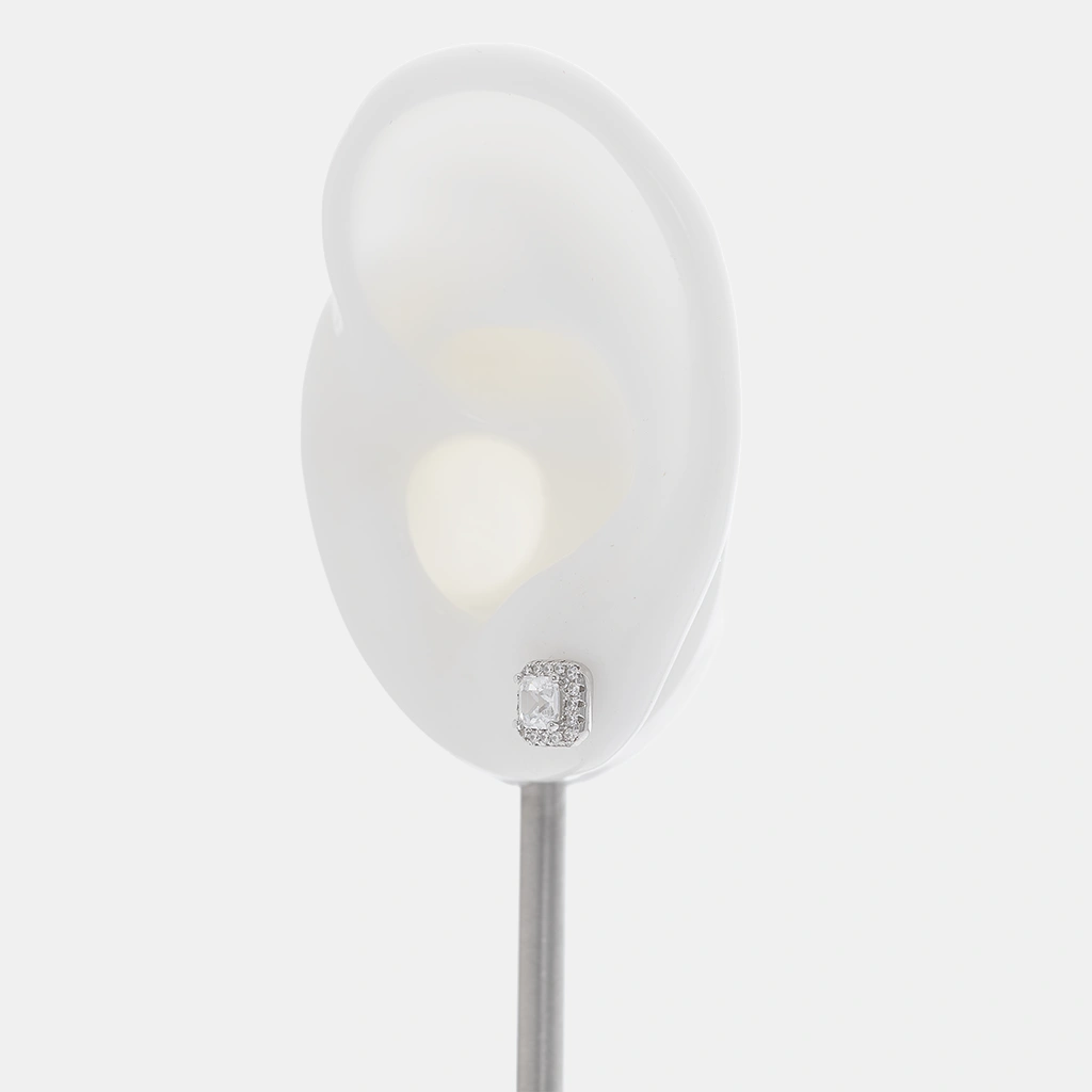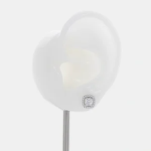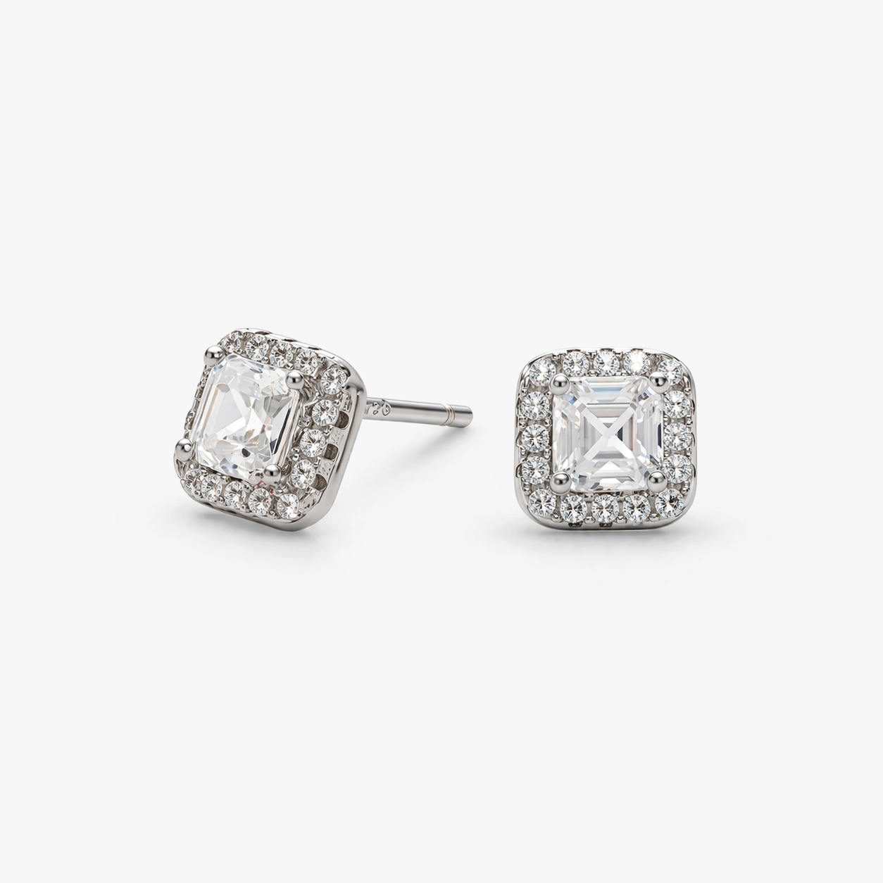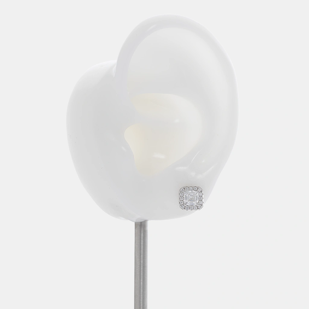 حلق ستد فضة 925 بتصميم مربع ناعم بمقاس مناسب للبس اليومي، مرصع بزركون شفاف مربع في الوسط وإطار هالو من زركون دائري، مع قفل دفع فراشة وتشطيب روديوم.