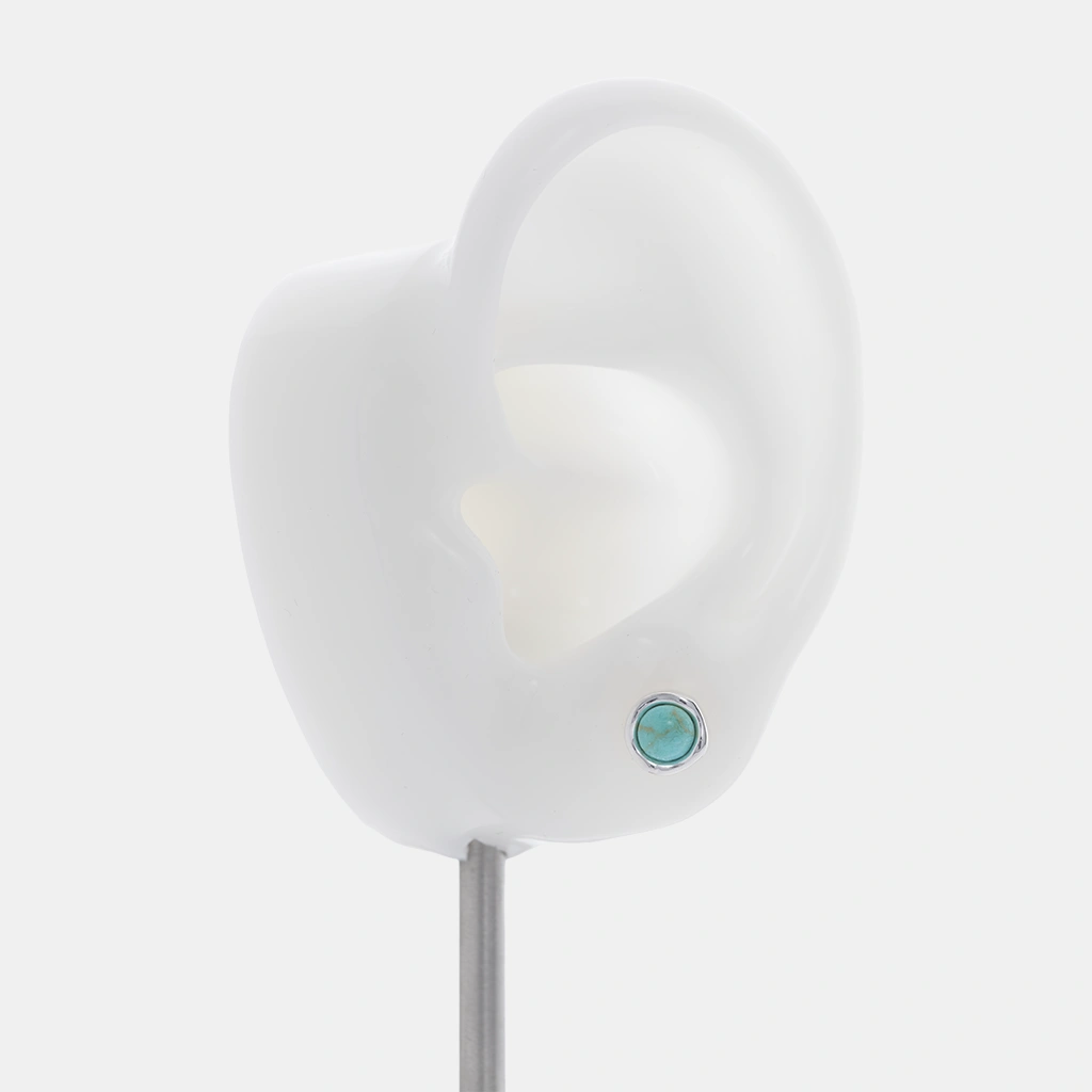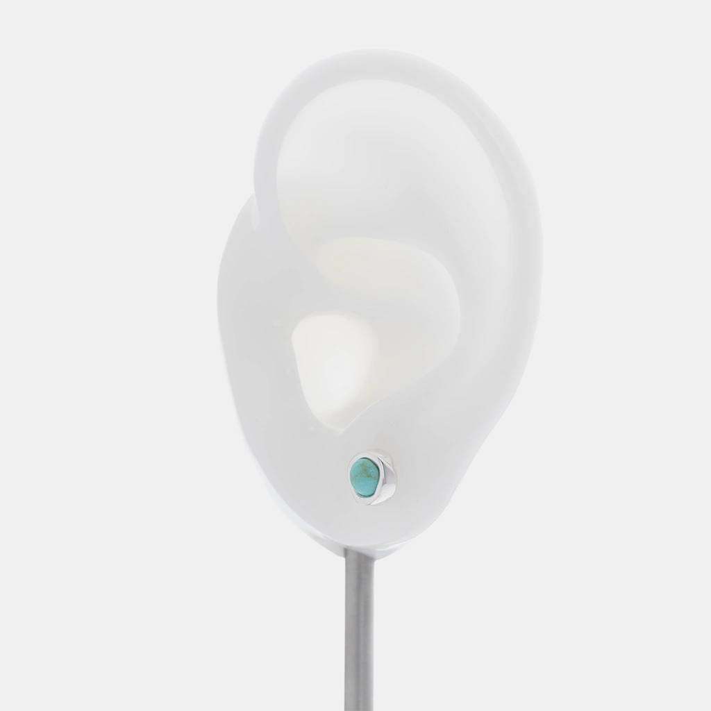 حلق فضة ناعم ستد مصنوع من فضة إسترلينية 925 مع فينيش بوليش، يضم حجر فيروز سنثتك دائري بلون فيروزي داخل تثبيت بإطار محيط، وقفل دفع فراشة.