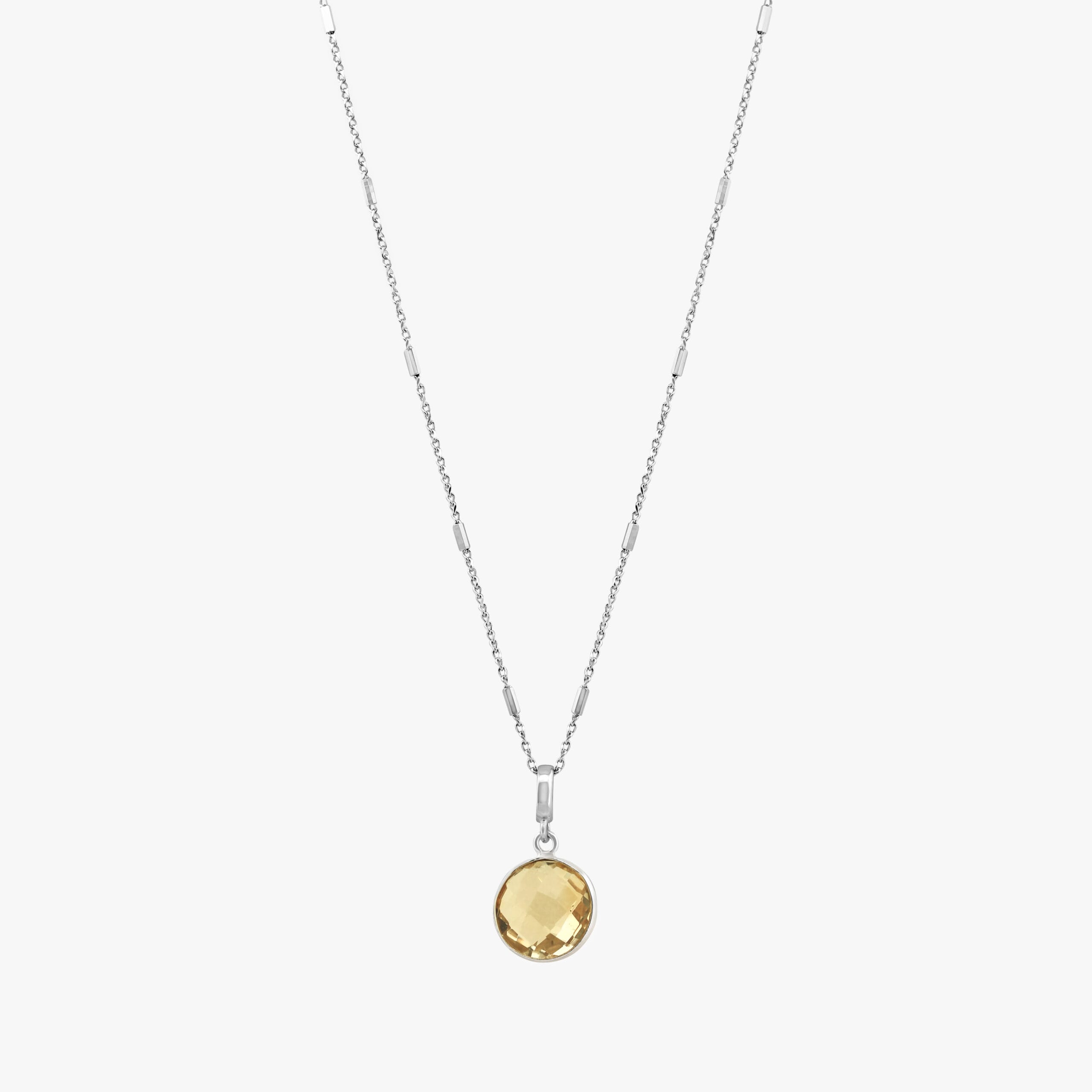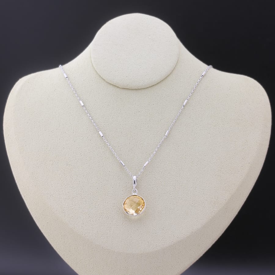 عقد فضة أنيق يتدلى منه حجر سترين دائري مقطوع بشكل متقاطع ليعكس الضوء بلمعان مميز. يتميز الحجر بلونه الأصفر المشرق.