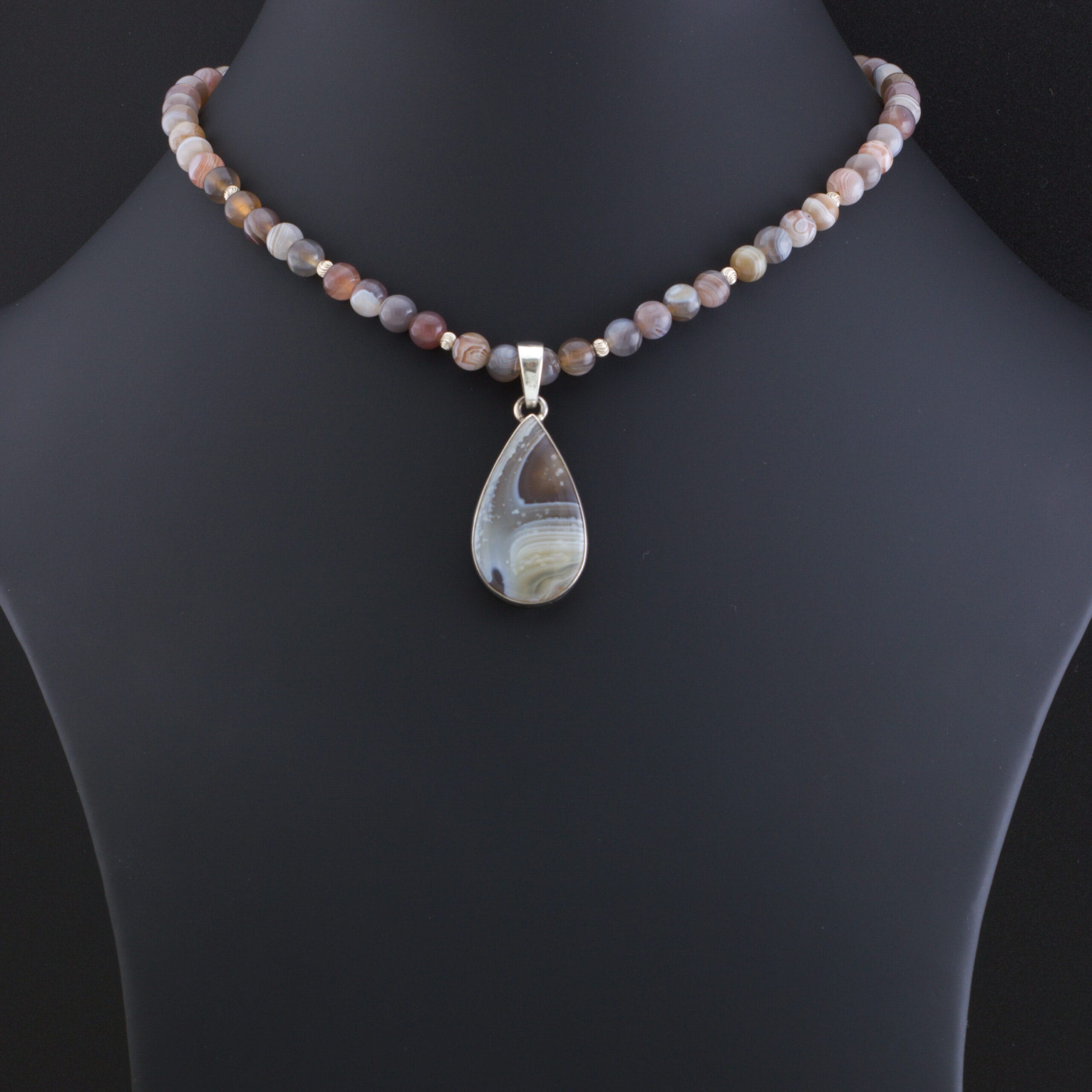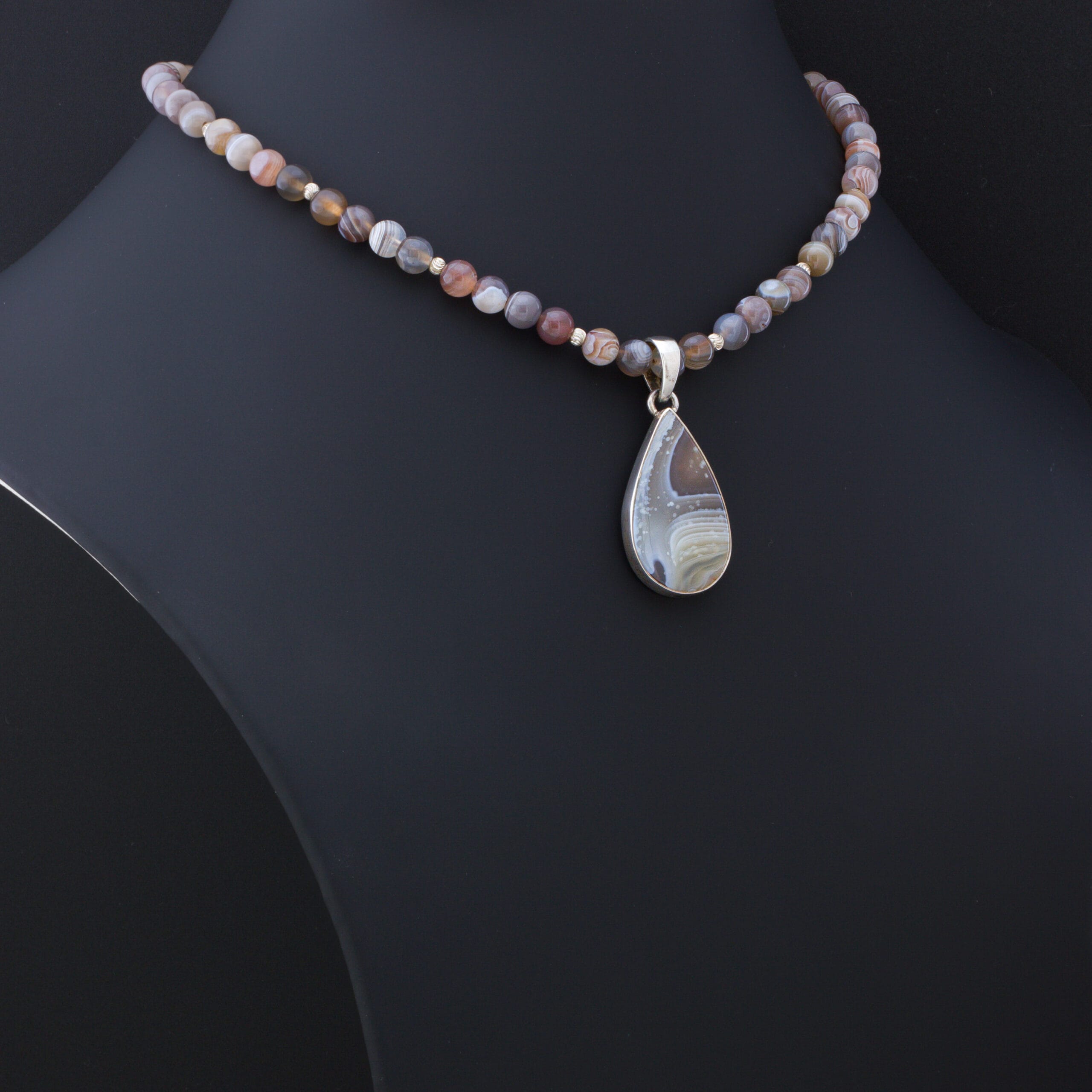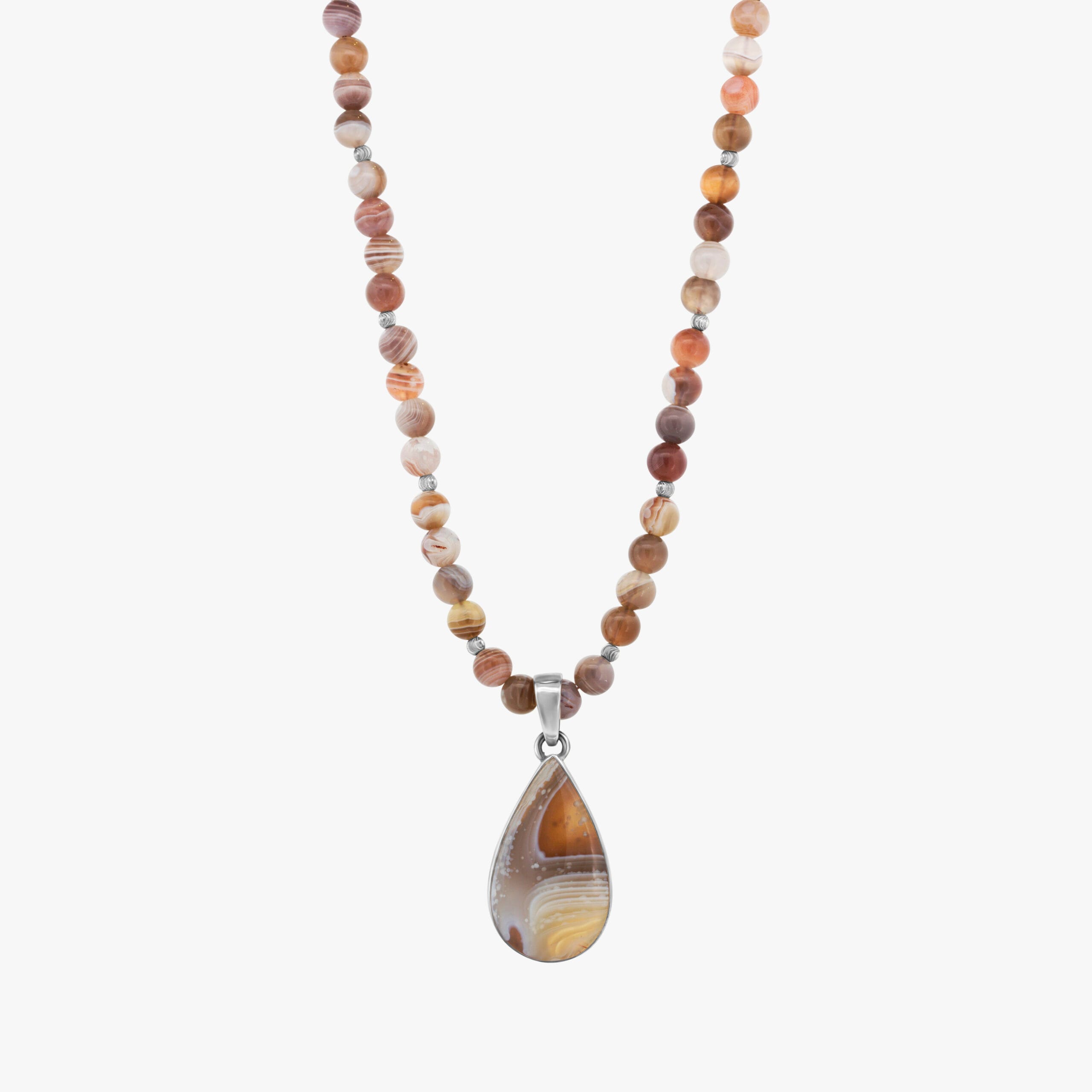 عقد فضة بسلسلة وحجر من العقيق البوتسواني الطبيعي، يتميز بتدرجات ألوان دافئة وخطوط فريدة من نوعها. العقيق البوتسواني يرمز للصبر والقوة الداخلية.