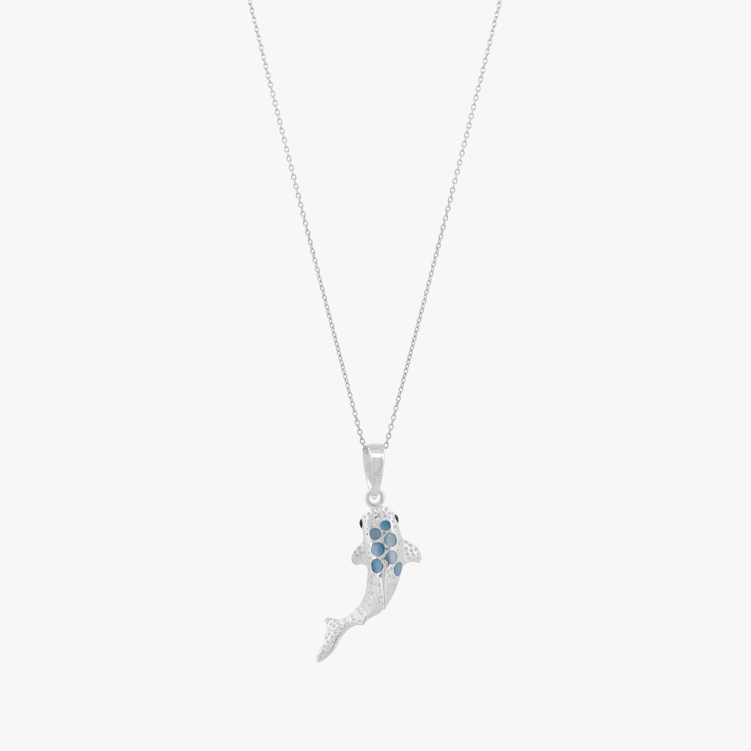 قلادة فضة 925 بتصميم فريد على شكل سمكة مزينة بصدف سماوي مما تضيف لمسة من الحيوية والانتعاش. قطعة مستوحاة من البحر، مثالية لعشاق التميز والطبيعة البحرية.