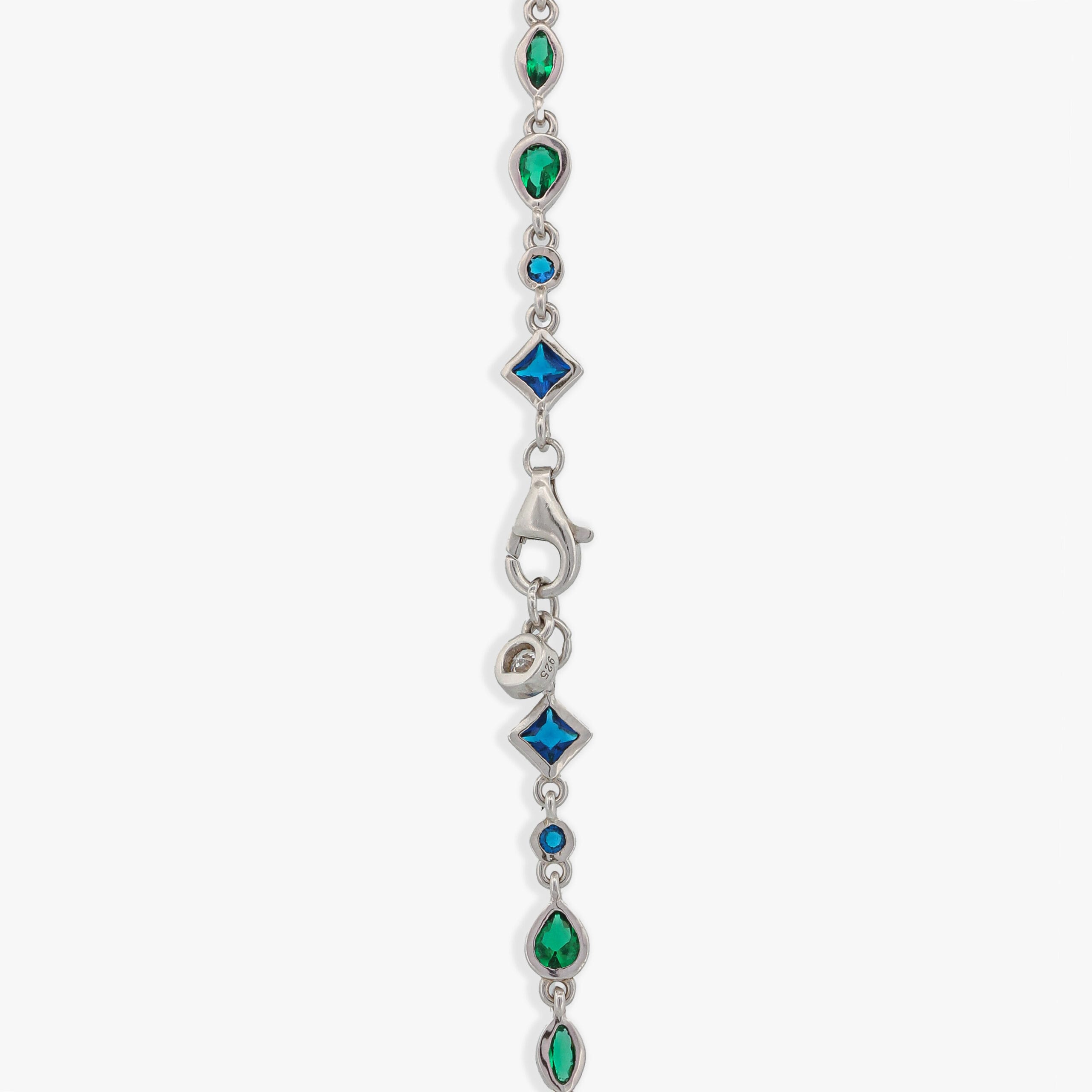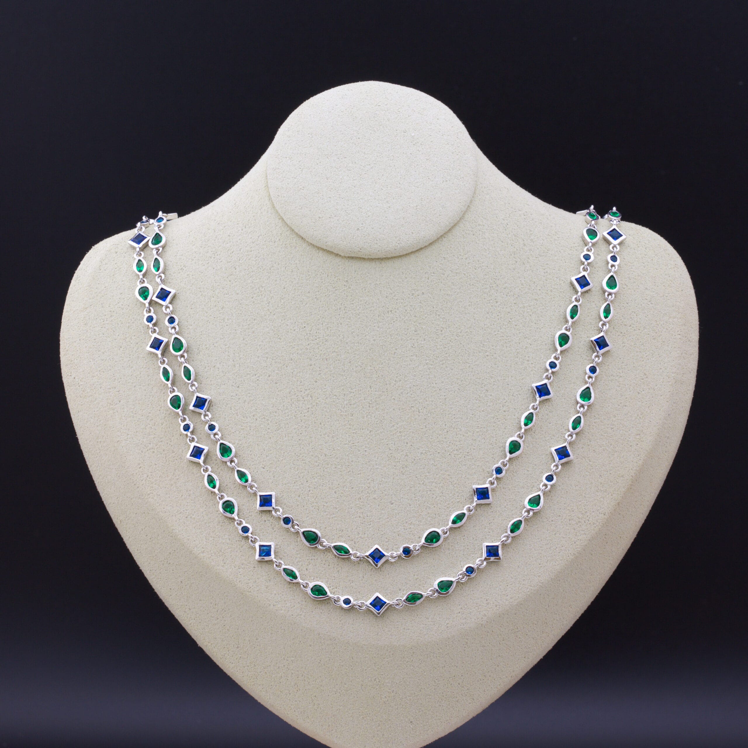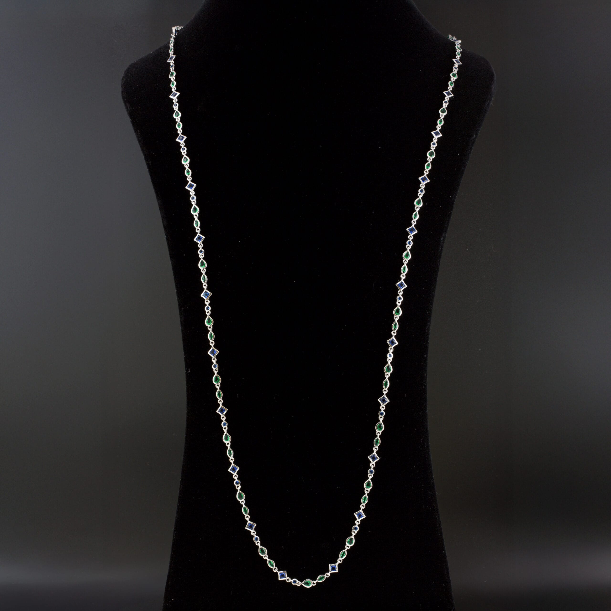 سلسلة طويلة (سبحة) من الفضة الأصلية مرصعة بفصوص بيضاوية ومربعة بألوان الزرقاء والخضراء، تصميم يضيف لمسة فاخرة ومميزة لمناسبتك.