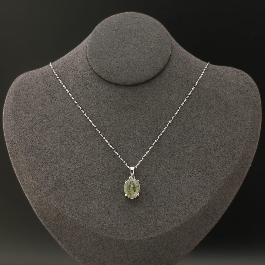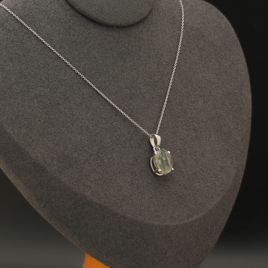 عقد فضة بحجر العقيق الطحلبي الطبيعي بيضاوي أنيق، يتميز بتداخلات خضراء فريدة تشبه لوحات الطبيعة.