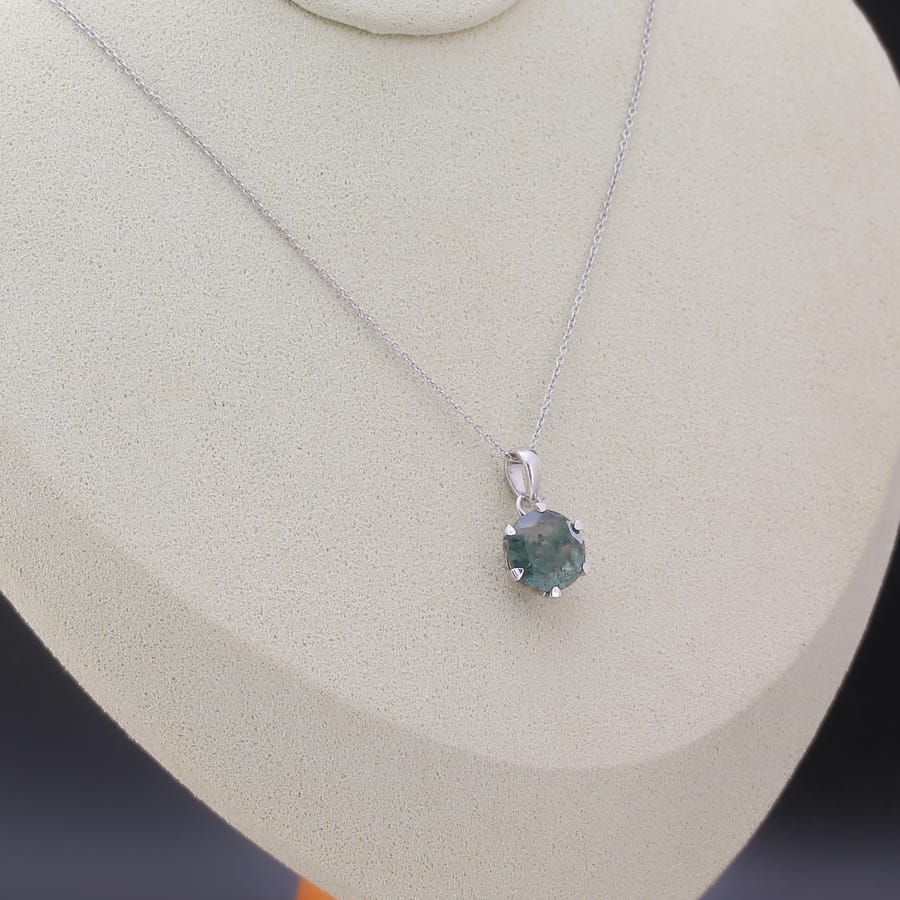 عقد فضة بحجر العقيق الطحلبي الطبيعي دائري أنيق، يتميز بتداخلات خضراء فريدة تشبه لوحات الطبيعة.