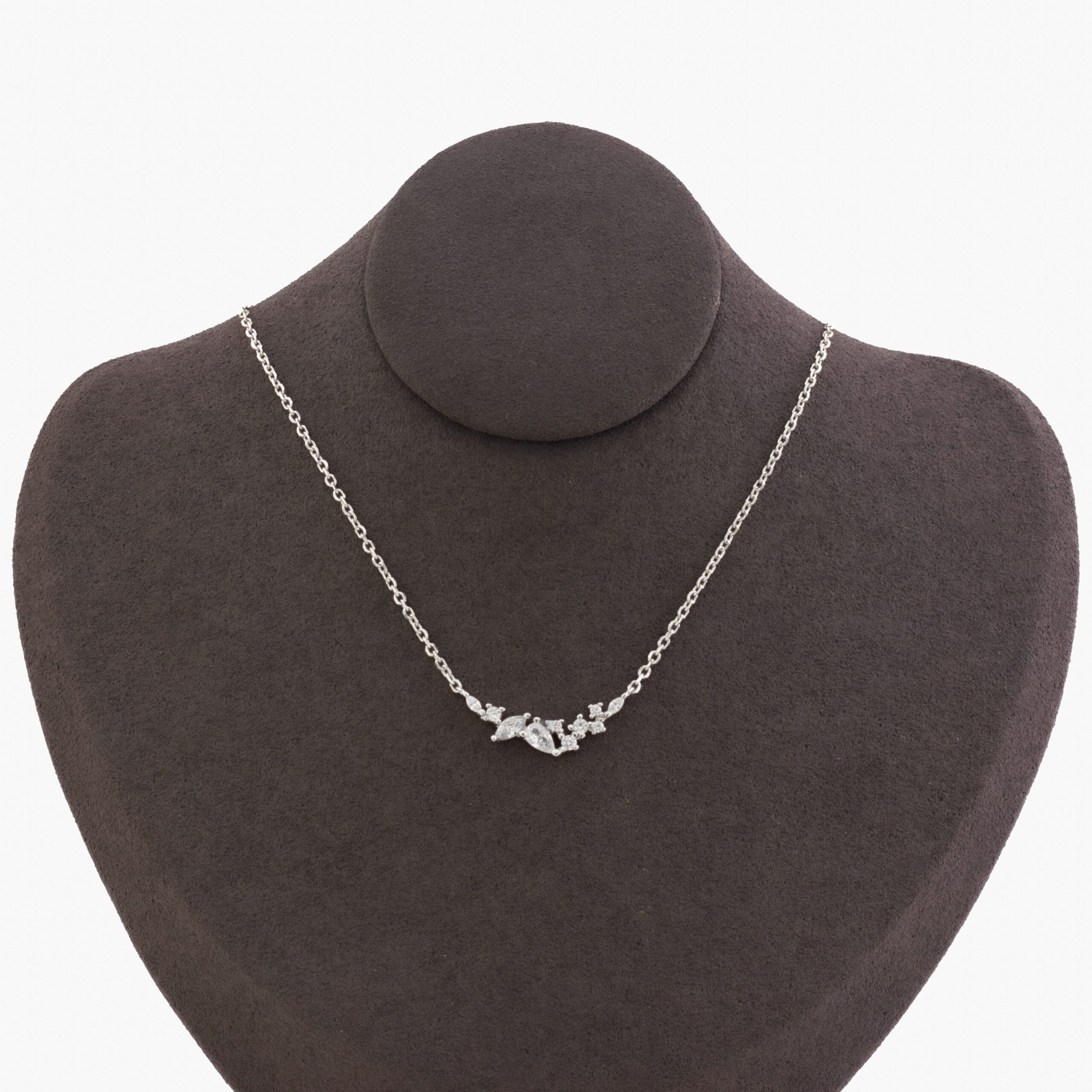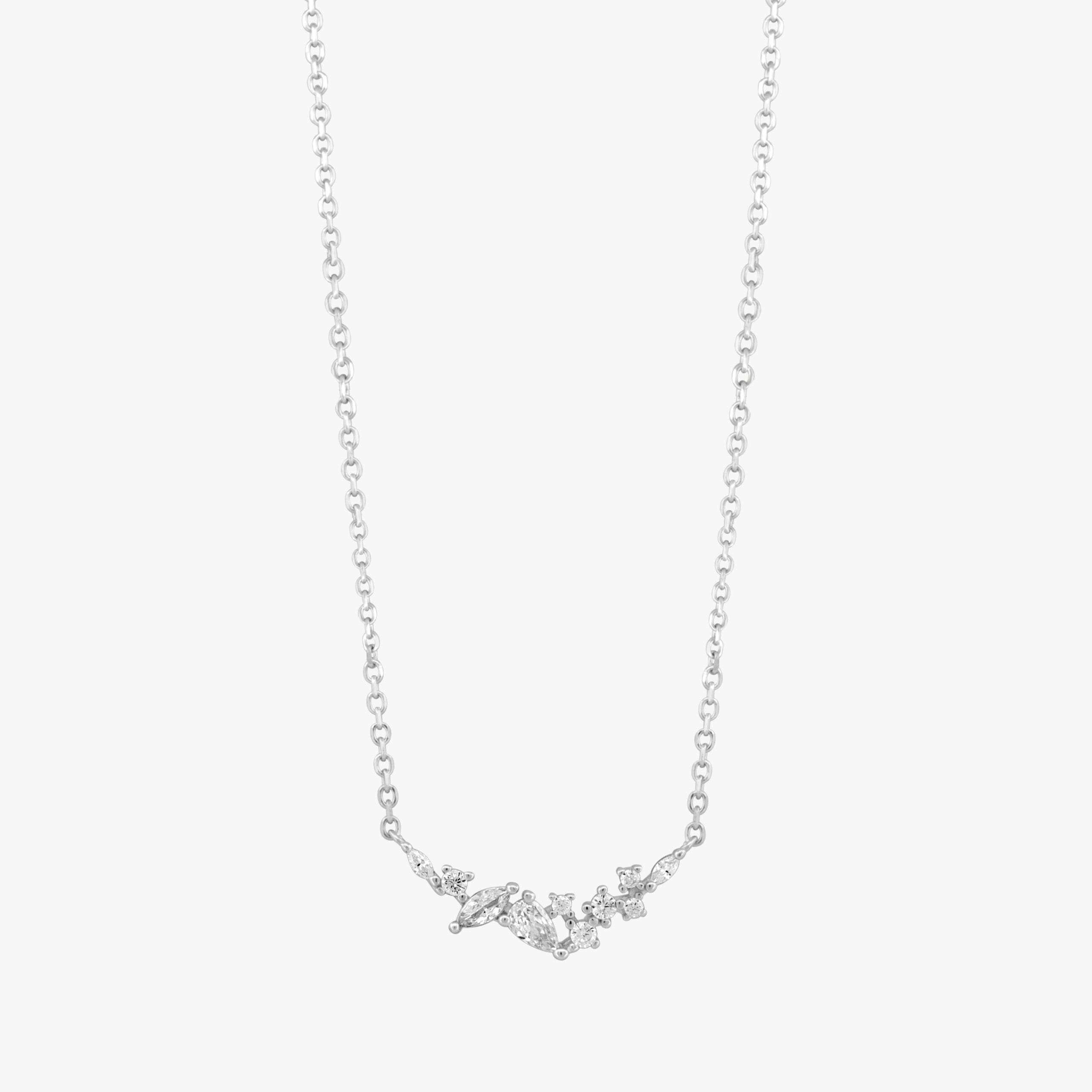 قلادة فضة استرلينية مصممة بأناقة مع مجموعة من أحجار الزركون المتلألئة بأشكال وأحجام متنوعة، مرتبة بشكل فني. تضفي لمسة من الرقي واللمعان الفريد لإطلالتك العصرية.