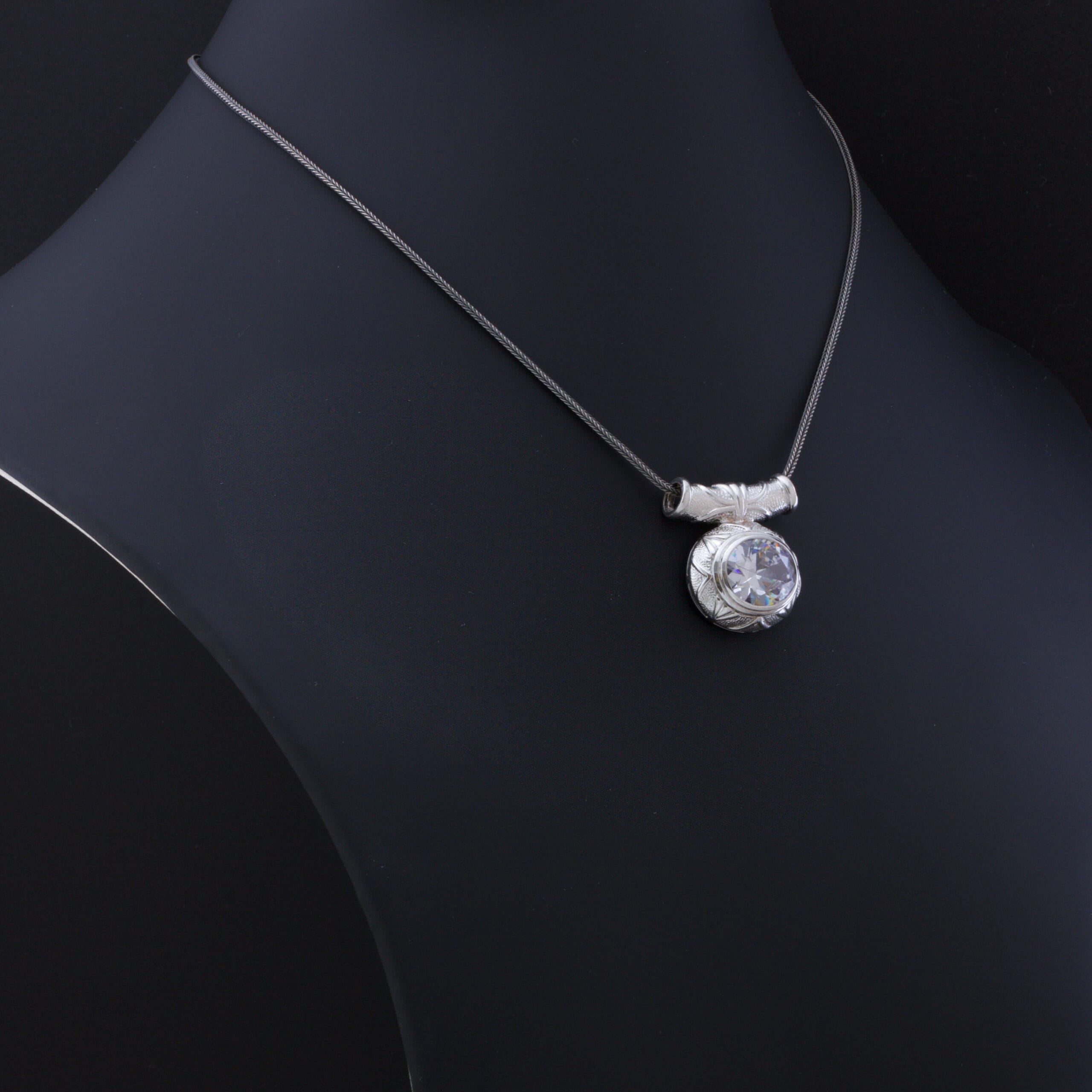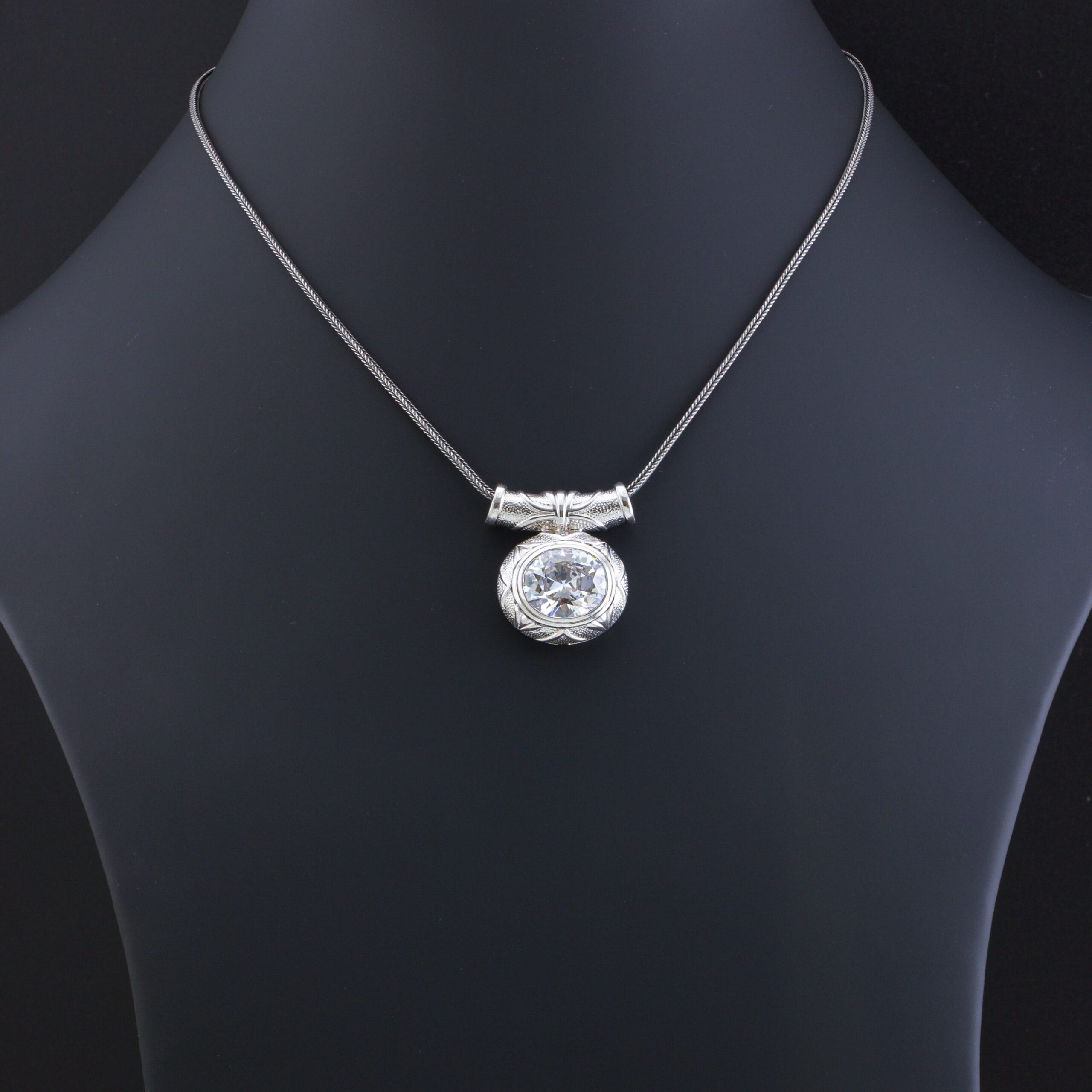عقد فضة إسترليني عيار 925. يتميز تصميمه بالدق (النقش) اليدوي مما يبرز الجمال الكلاسيكي الفاخر للقطعة، مما يجعله مثاليًا للارتداء اليومي أو للمناسبات الخاصة.