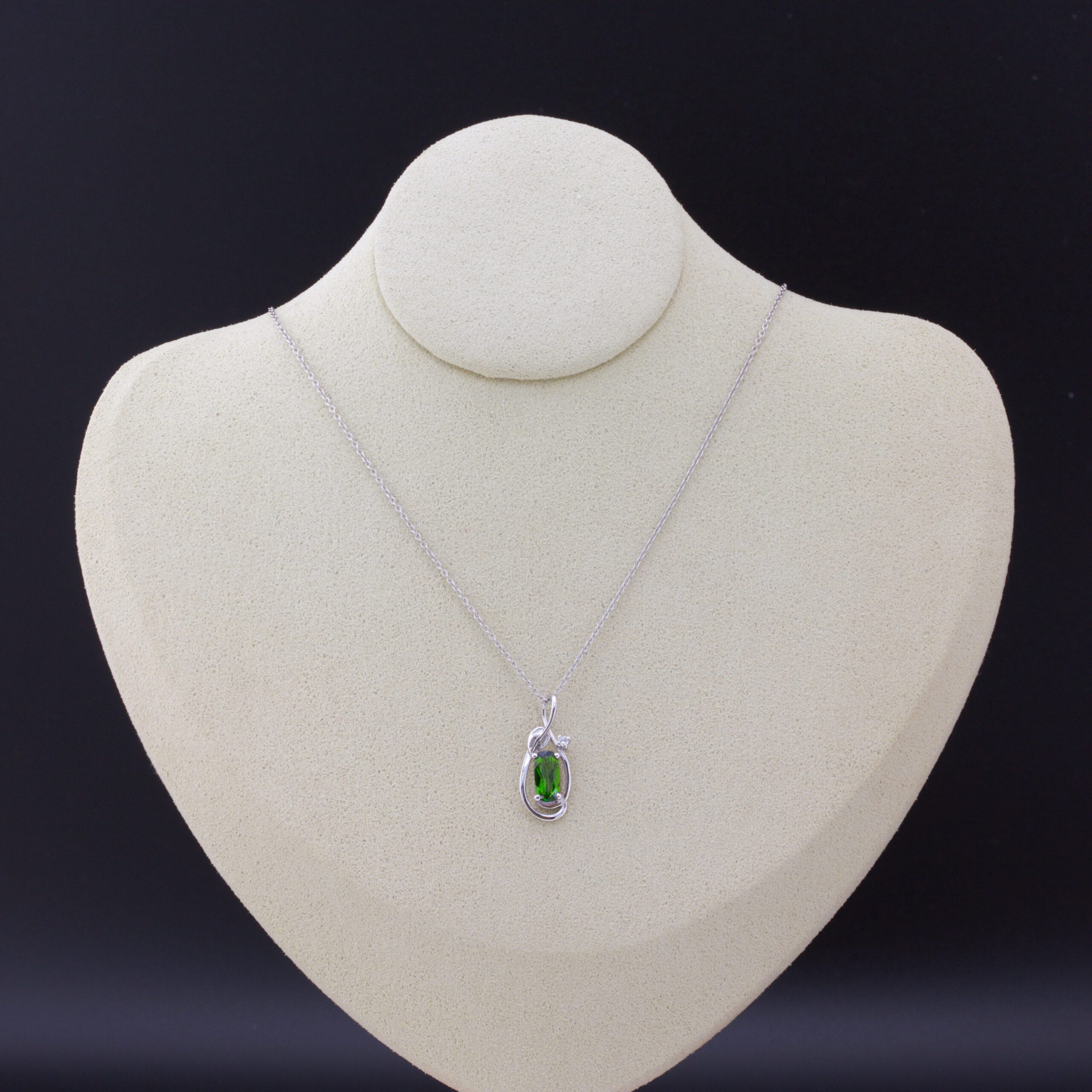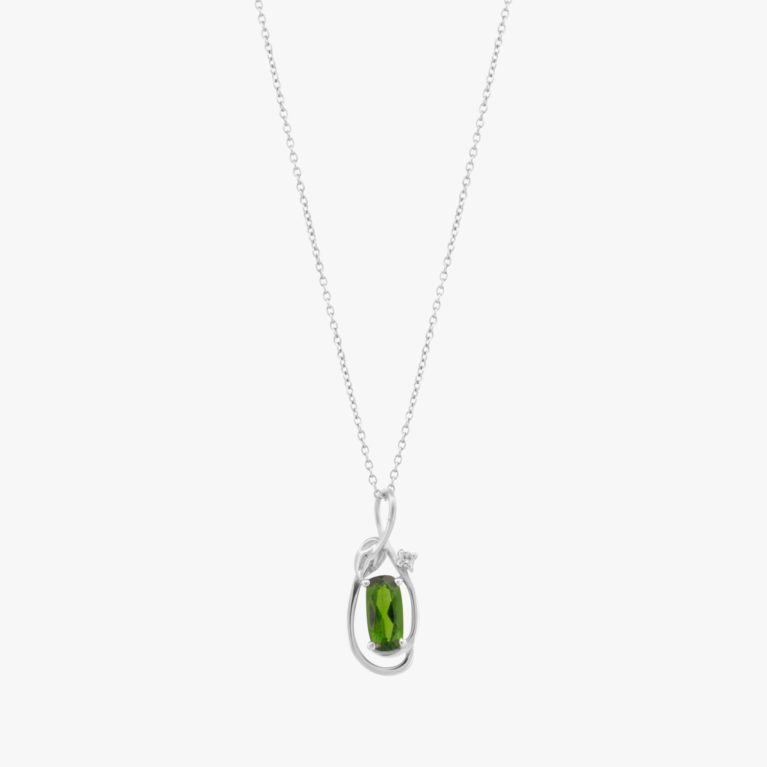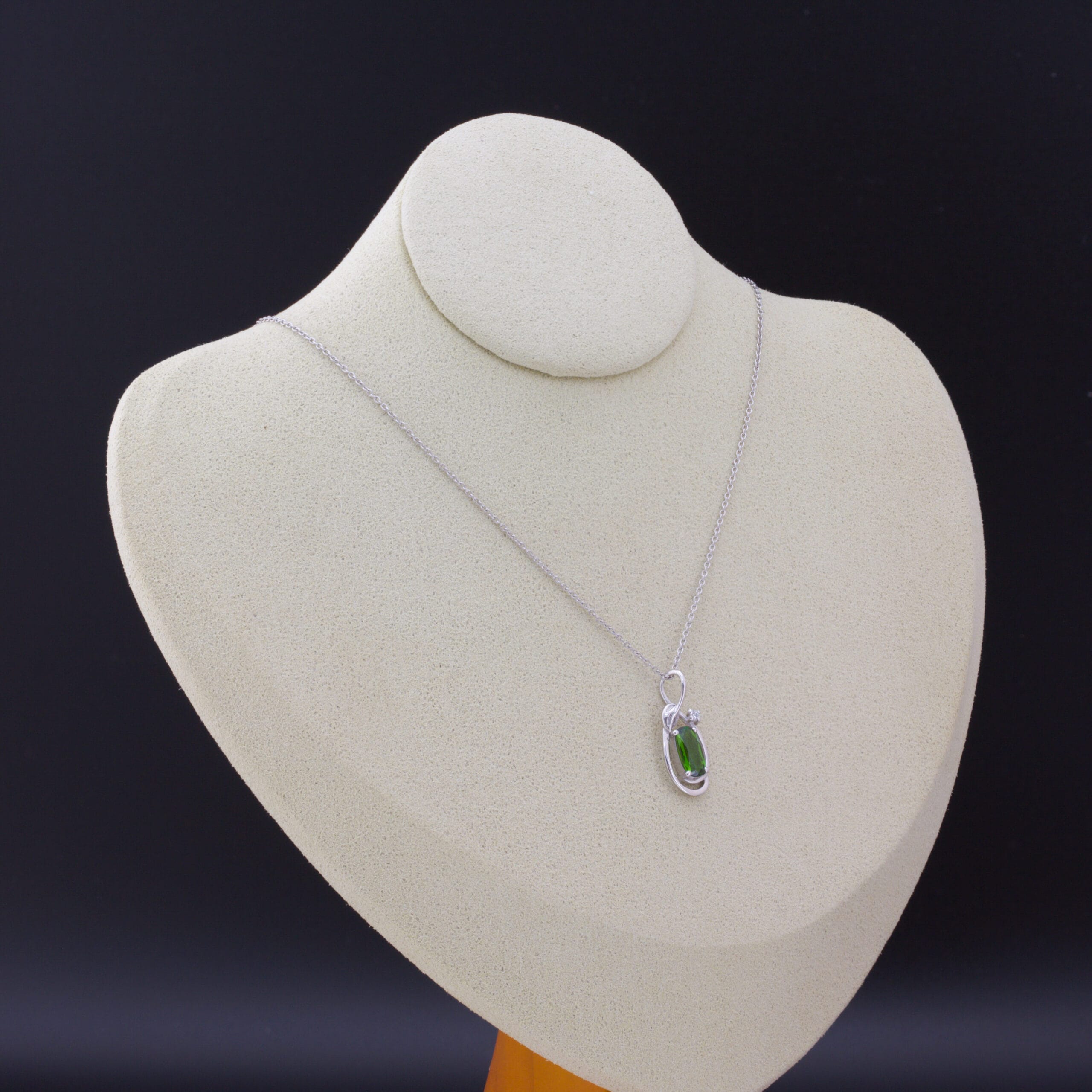 عقد فضة إسترليني عيار 925 بحجر ديوبسيد طبيعي بيضاوي مع لمسة فنية في التصميم وحجر صغير براق. أنيق وخفيف، مثالي للارتداء اليومي ويمنح إطلالتك تميزًا وفخامة.