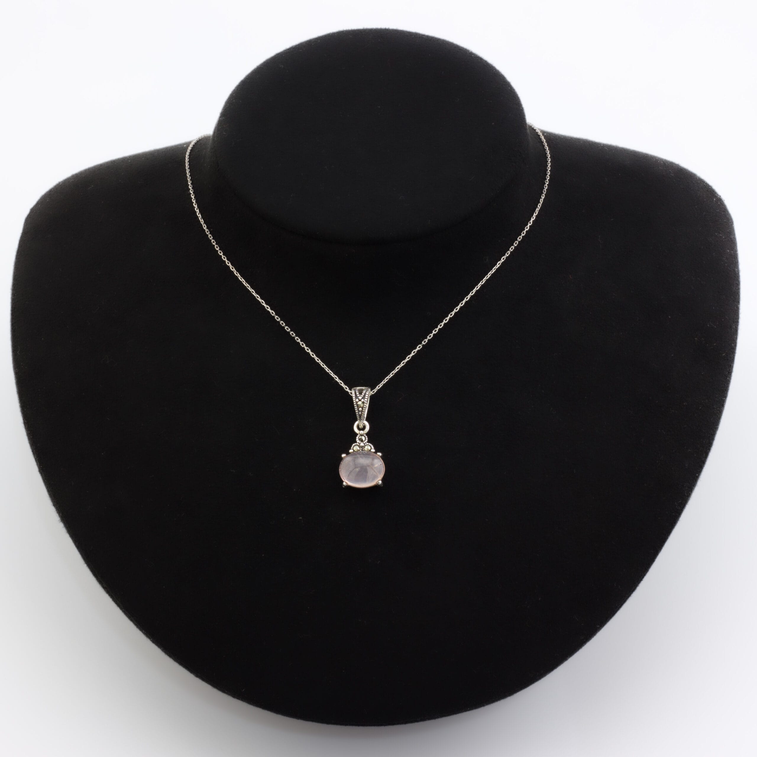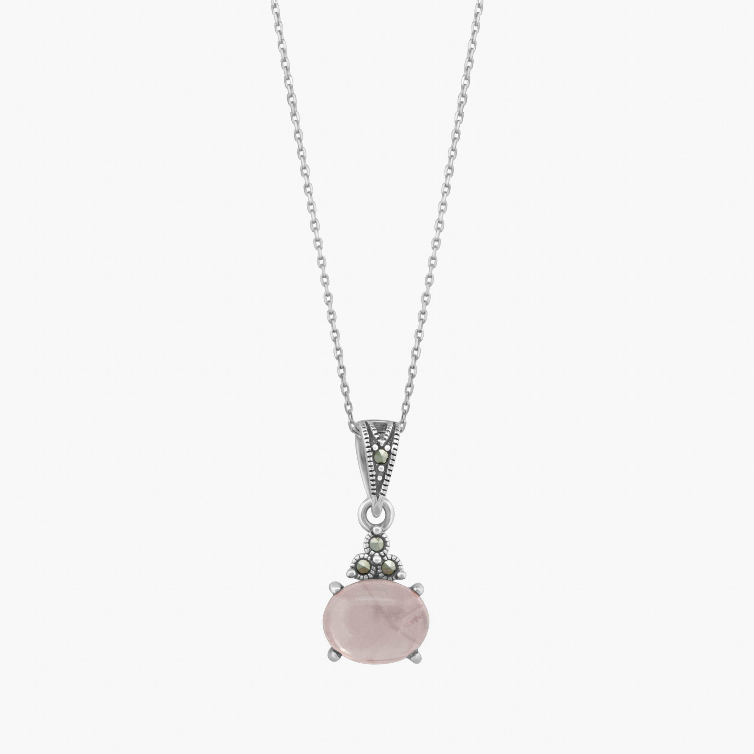 تعليقة وسلسال من الفضة يجمع بين حجر الكوارتز الوردي الطبيعي مع تصميم الماركازايت. تصميمها الكلاسيكي يضفي لمسة أناقة وجاذبية لإطلالتك.