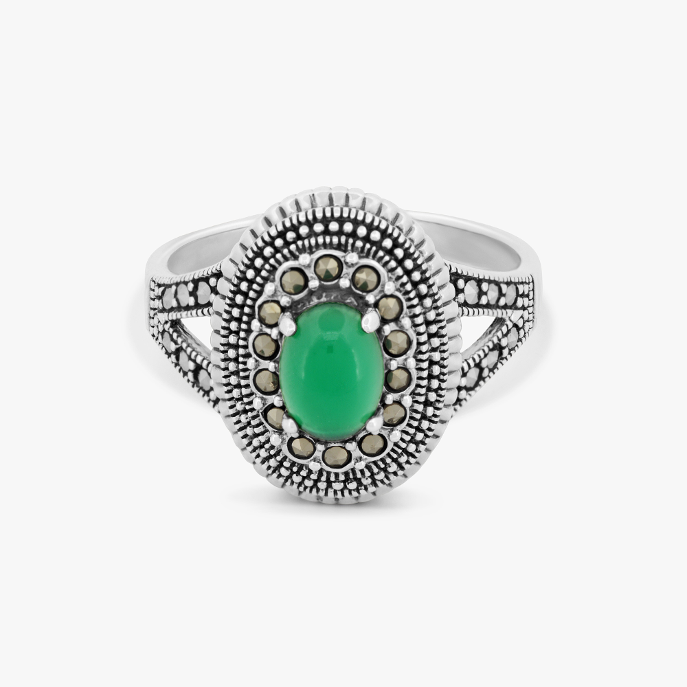 خاتم فضة بتصميم الماركازيت التراثي الفاخر، يتوسطه حجر كالسيدوني أخضر، محاط بأحجار البايرايت المميزة وتضفي عليها لمسة ملكية ساحرة.