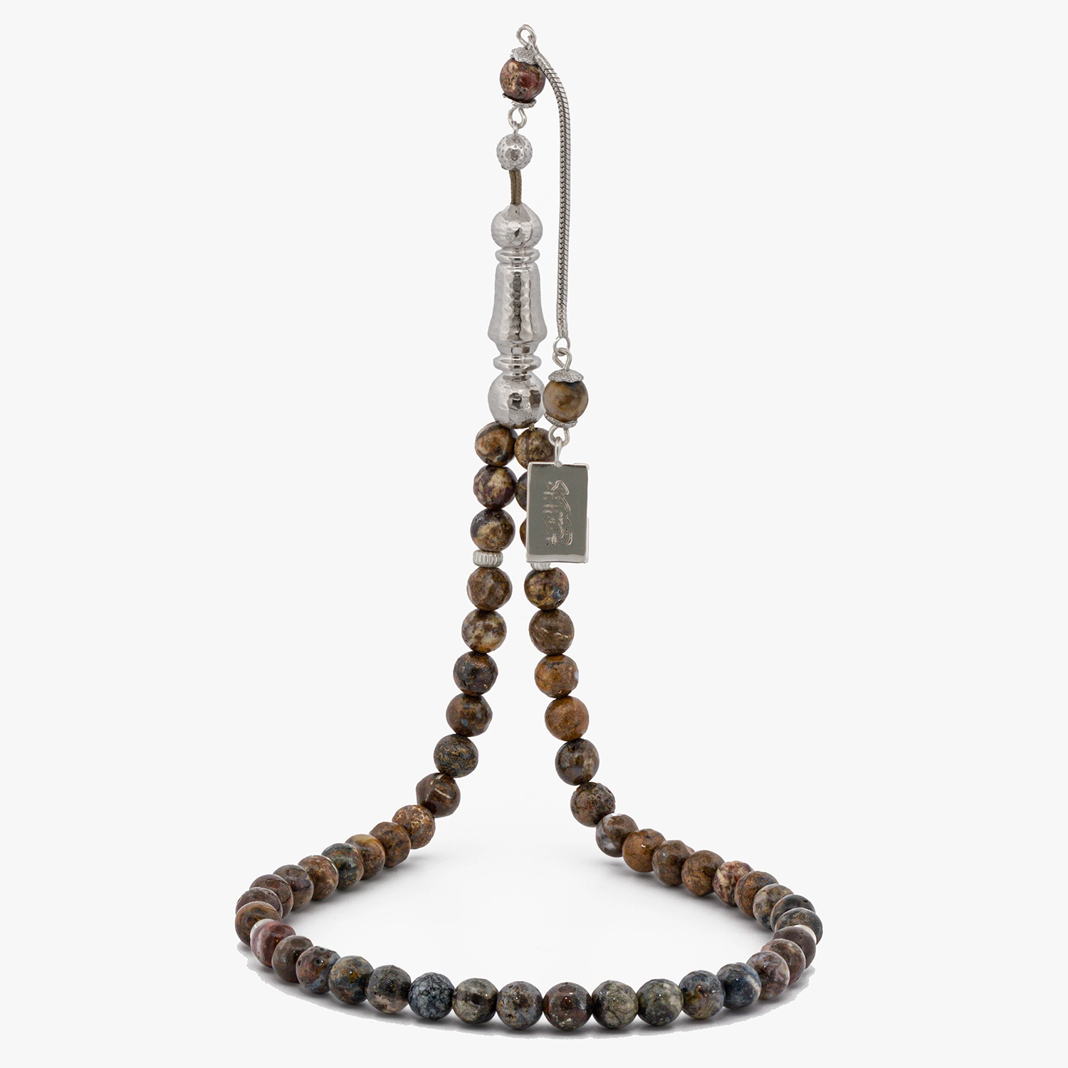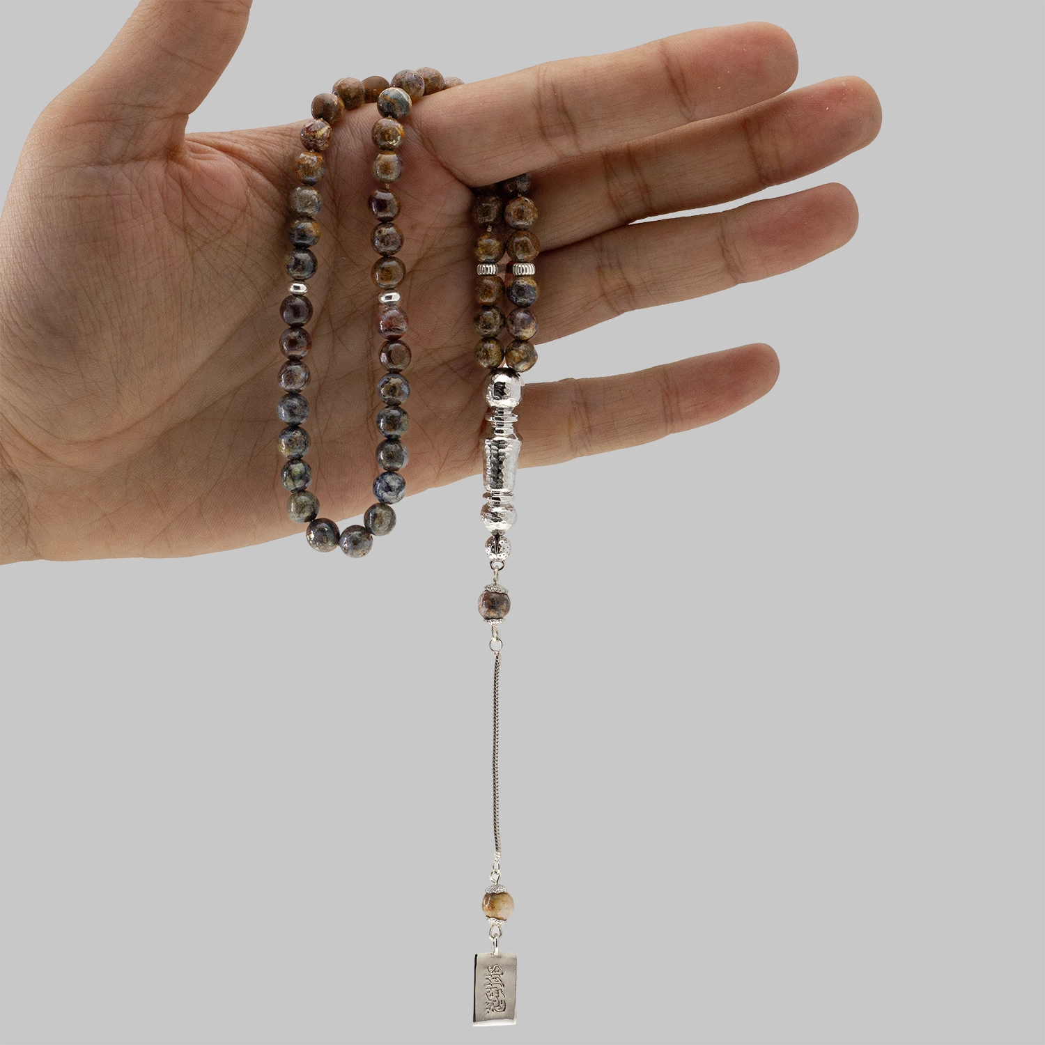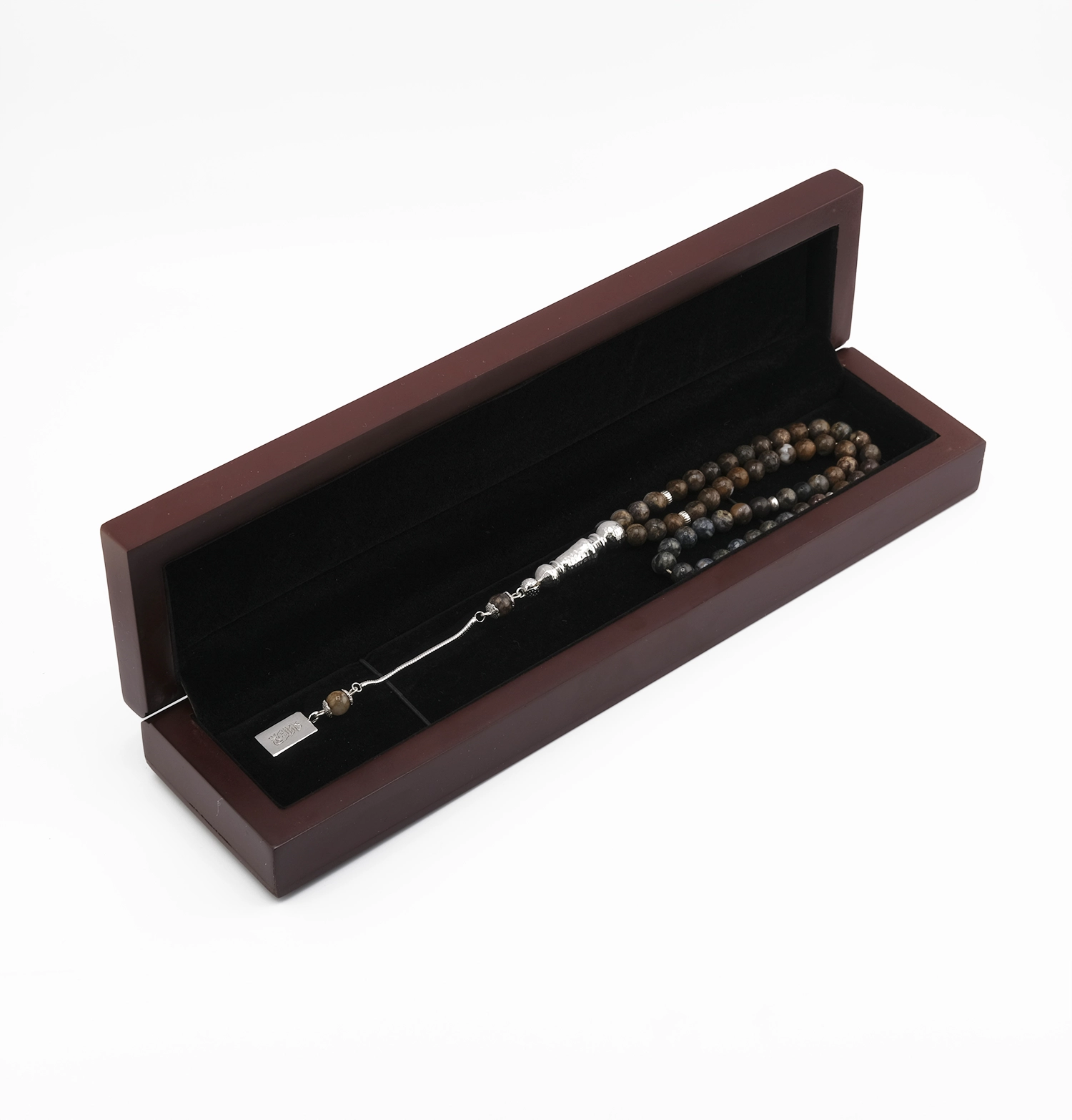 سبحة فاخرة من حجر البيترسايت الطبيعي المعروف بتدرجاته البنية الممزوجة بلمسات زرقاء رمادية، بحب، تتوجها مأذنة فضة من إبداع دار الشيخ لتجسد التميز والأناقة.