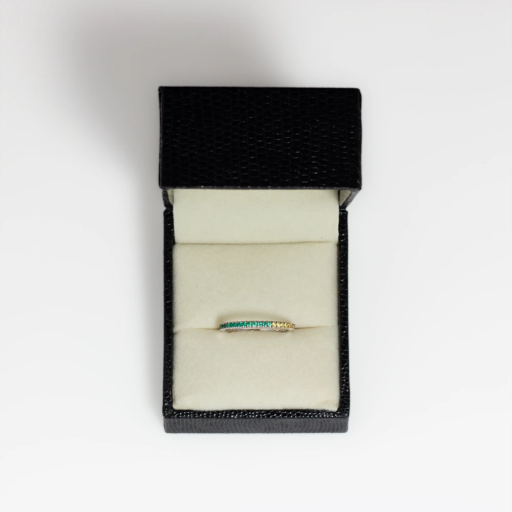 خاتم فضة بتصميم هالف اتيرنيتي، مرصع بأحجار صغيرة بتدرج لوني من الأخضر إلى الأصفر ثم الشفاف، مثبتة على جزء من محيط الخاتم.