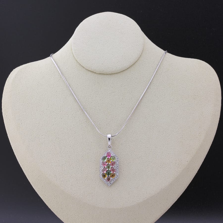 عقد فضة بحجر التورمالين الطبيعي ب 13 قطع بيضاوية تعكس ألوانًا متدرجة فريدة بين الأخضر والأزرق والوردي. تصميم أنيق يبرز جمال الحجر ويمنحه حضورًا مميزًا.