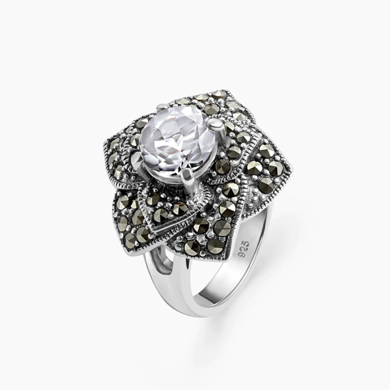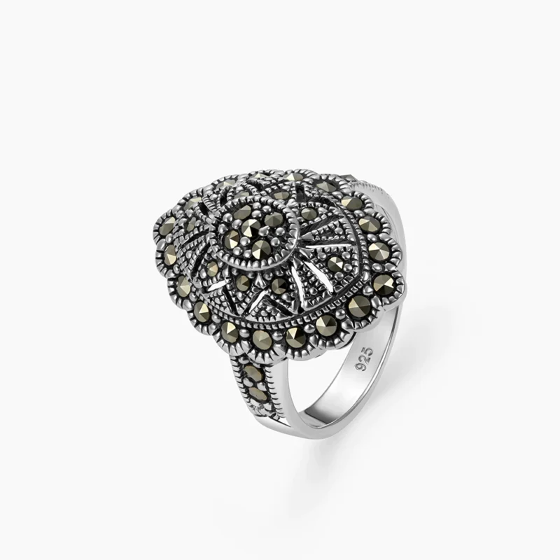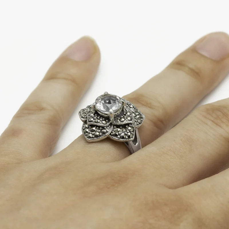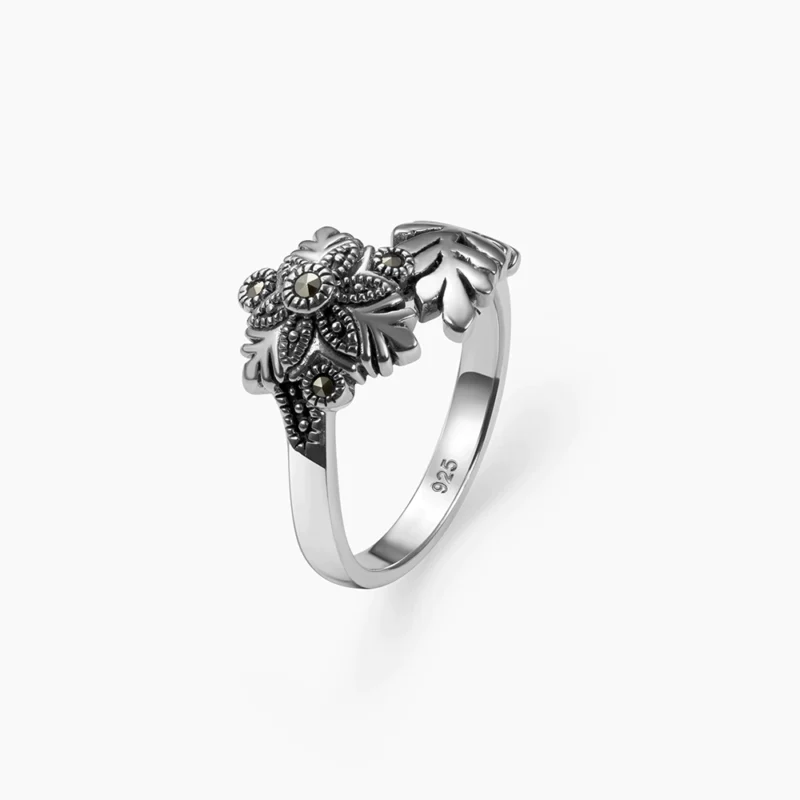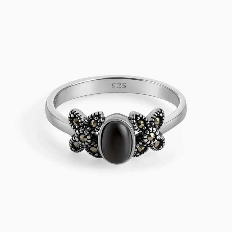 خاتم فضة ماركازيت بتصميم الزهرة (أونكس)