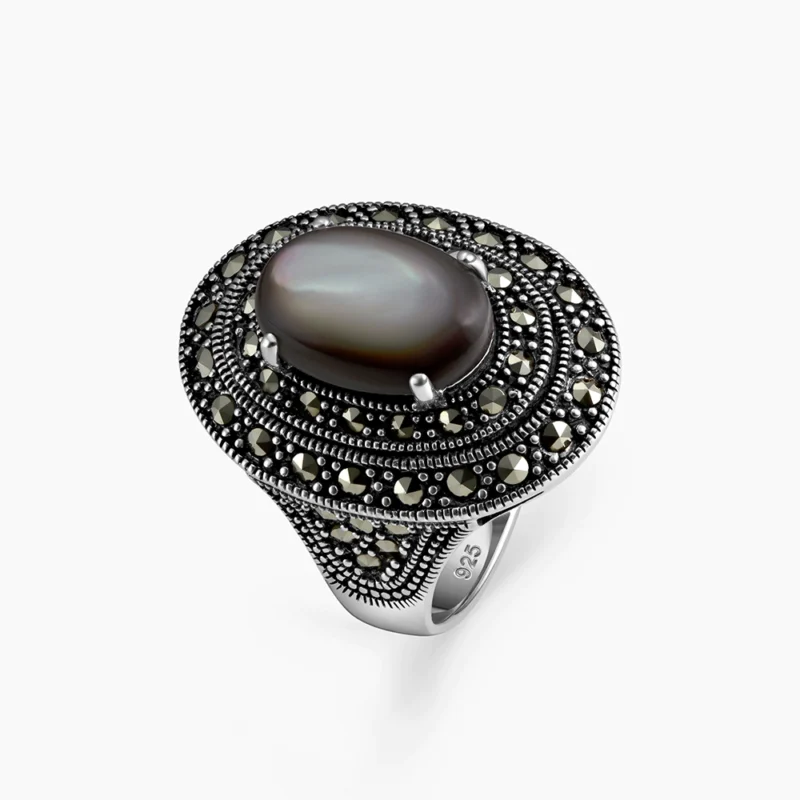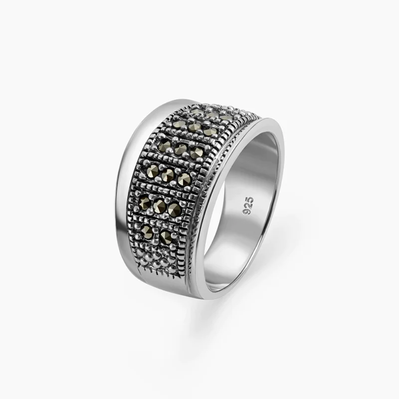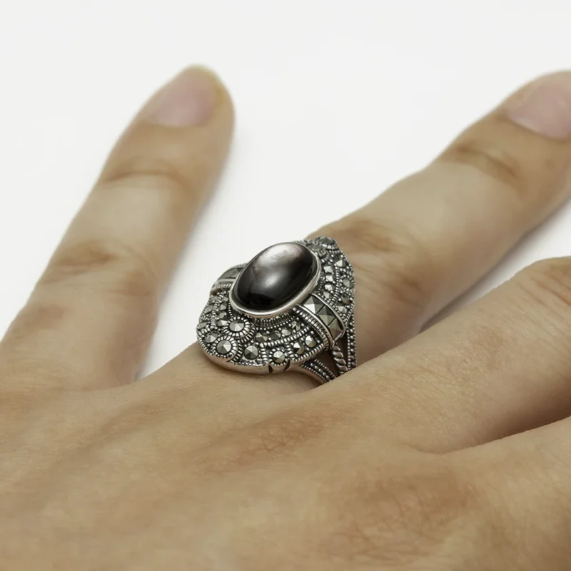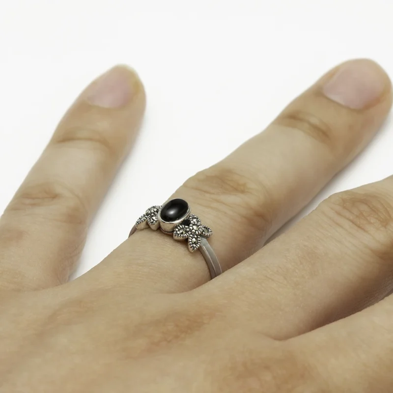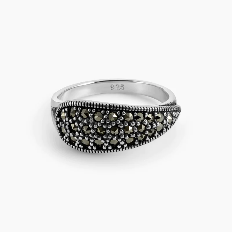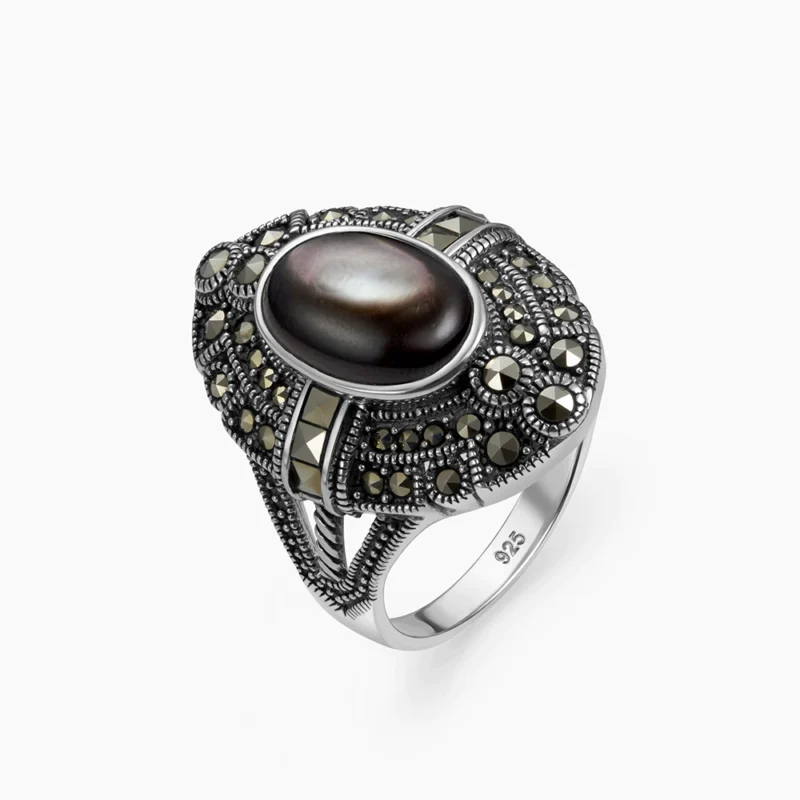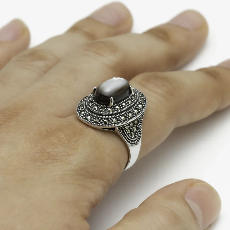 خاتم فضة الماركازيت مزخرف بحجر الصدف الأسود
