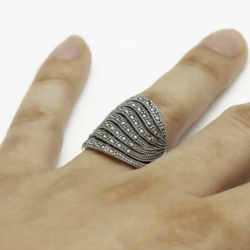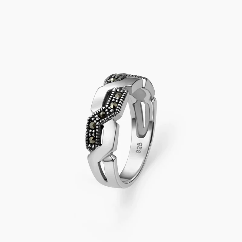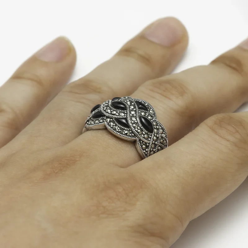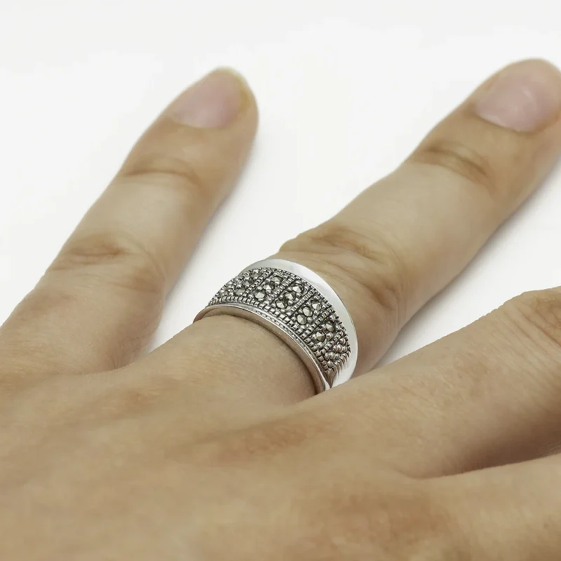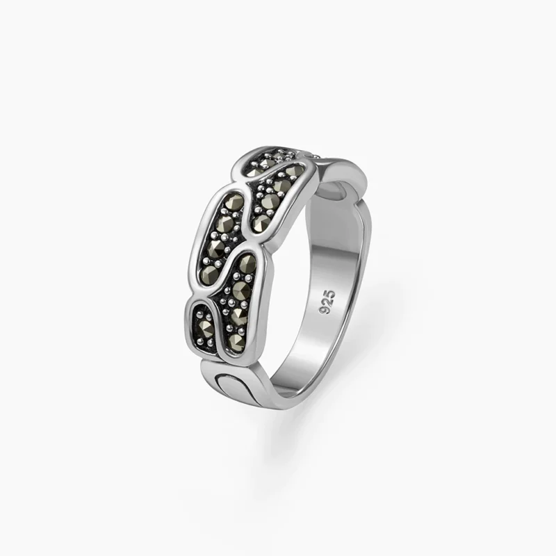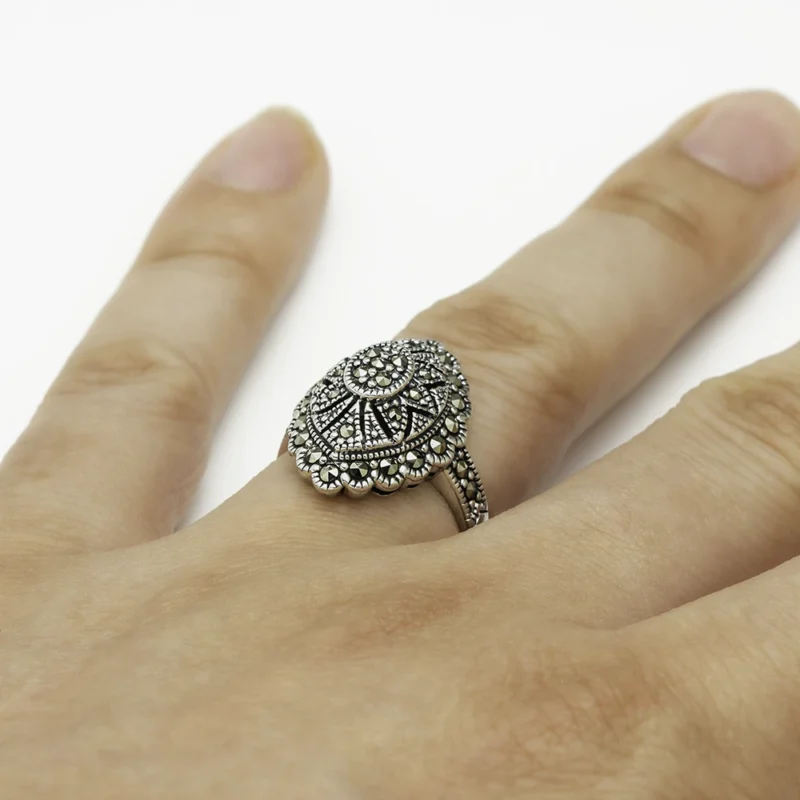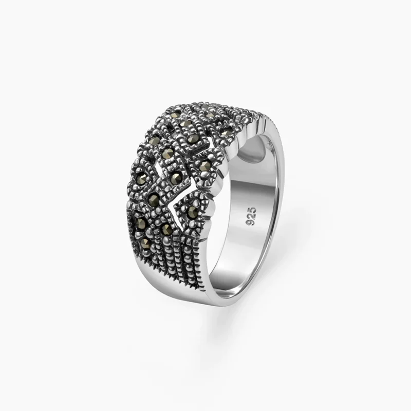 خاتم فضة الماركازيت مزخرف بحجر الصدف الأسود