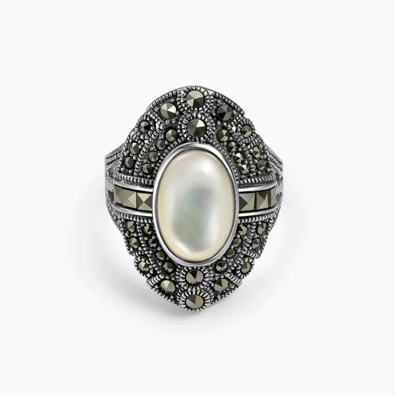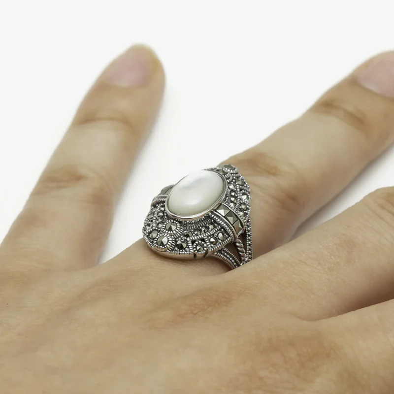 خاتم فضة الماركازيت مزخرف بحجر الصدف الأبيض