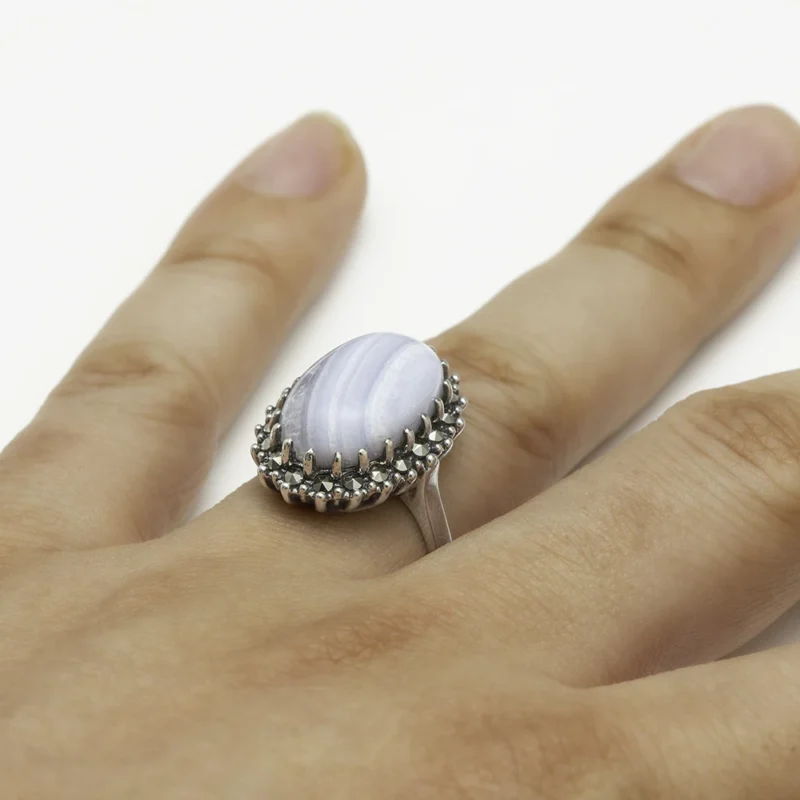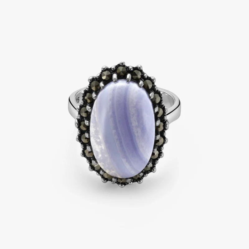 خاتم فضة الماركازيت هالو بحجر العقيق الأزرق