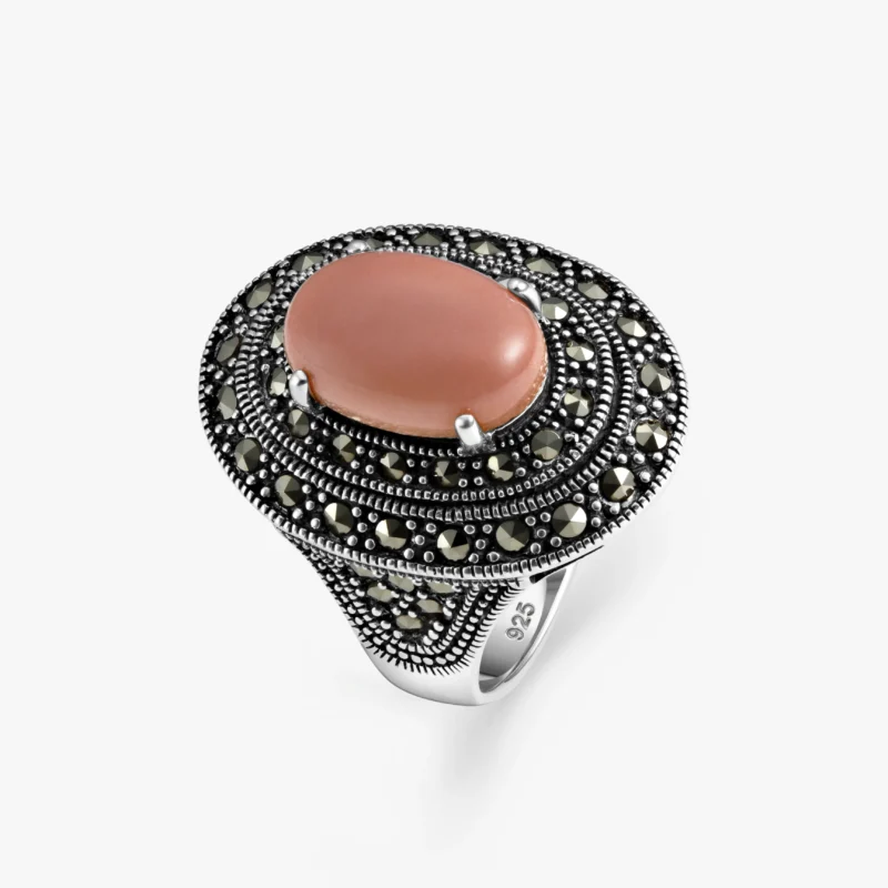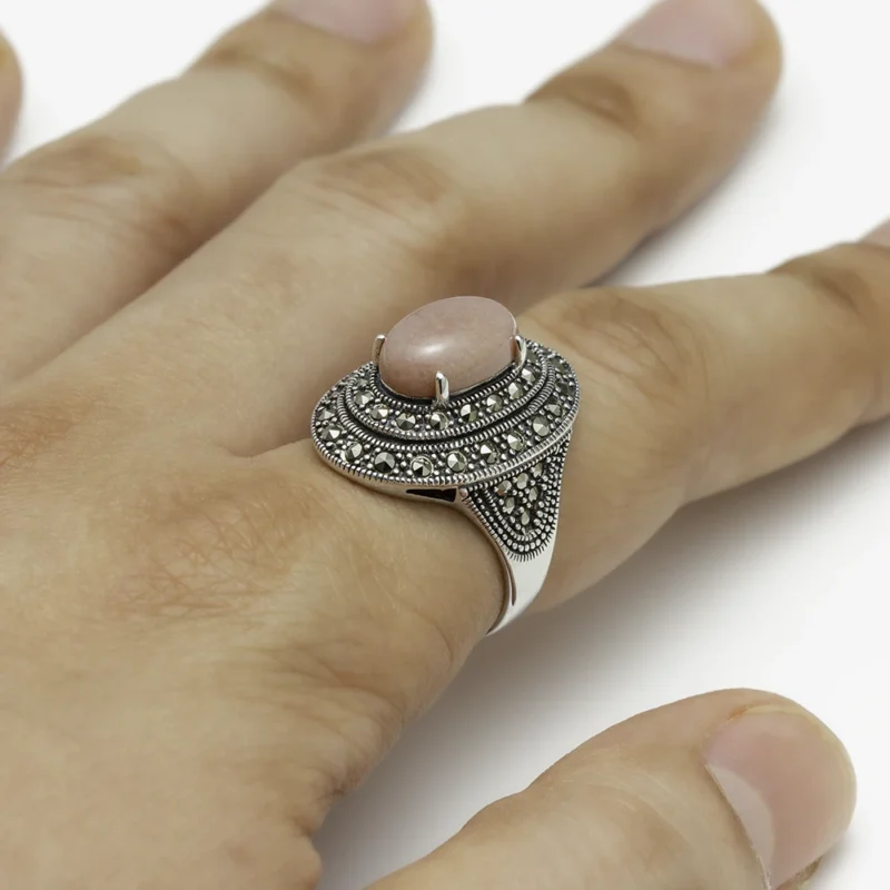 خاتم فضة ماركازيت بواجهة وردية (بيضاوي)