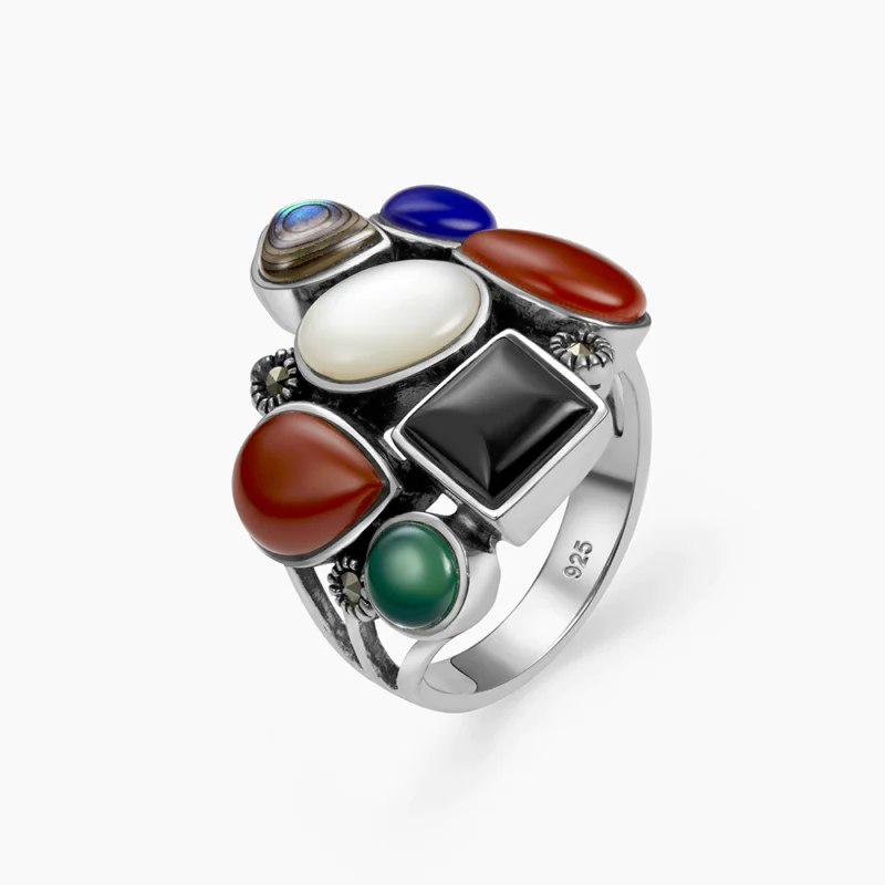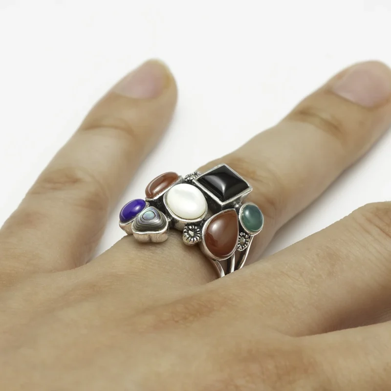 خاتم فضة الماركازيت ملتي أحجار