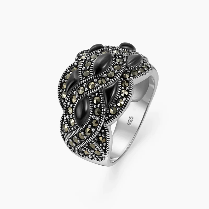 خاتم فضة الماركازيت بتصميم مموج بحجر الأونكس