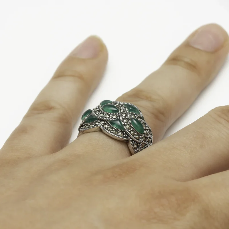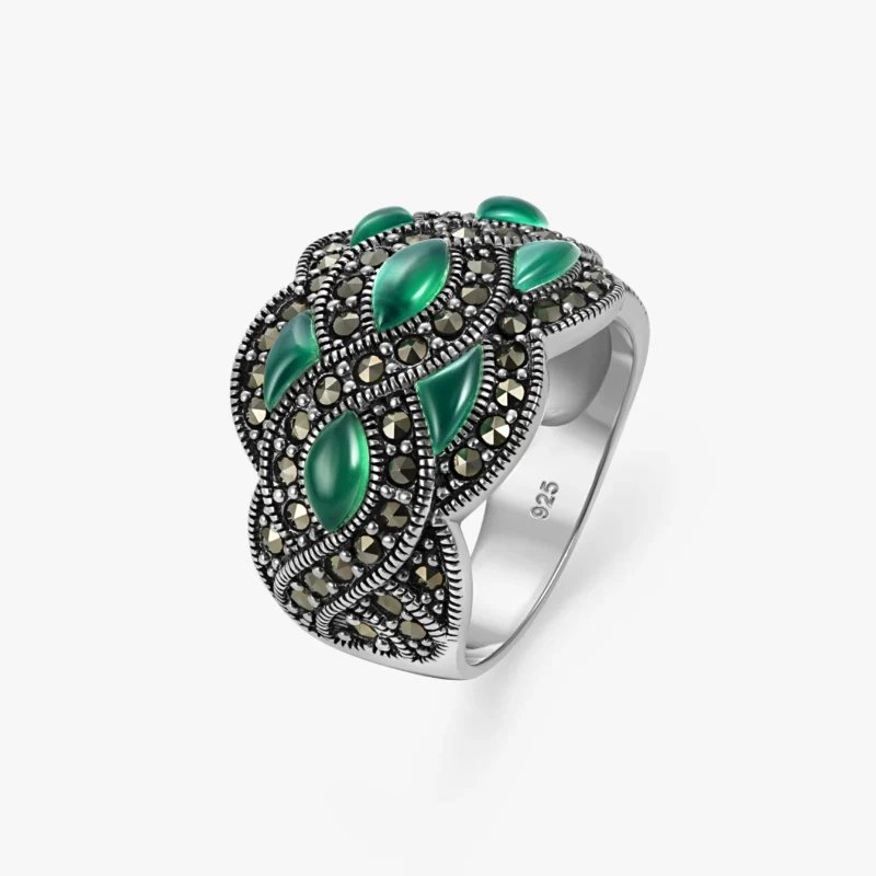خاتم فضة الماركازيت بتصميم مموج بحجر الكالسيدون الأخضر
