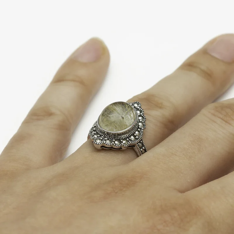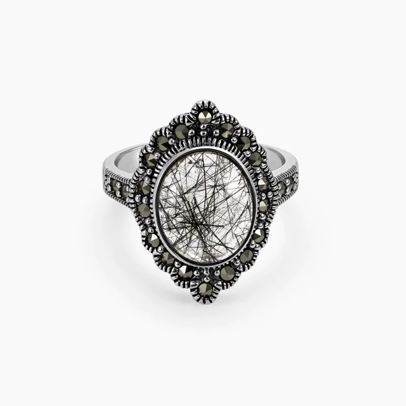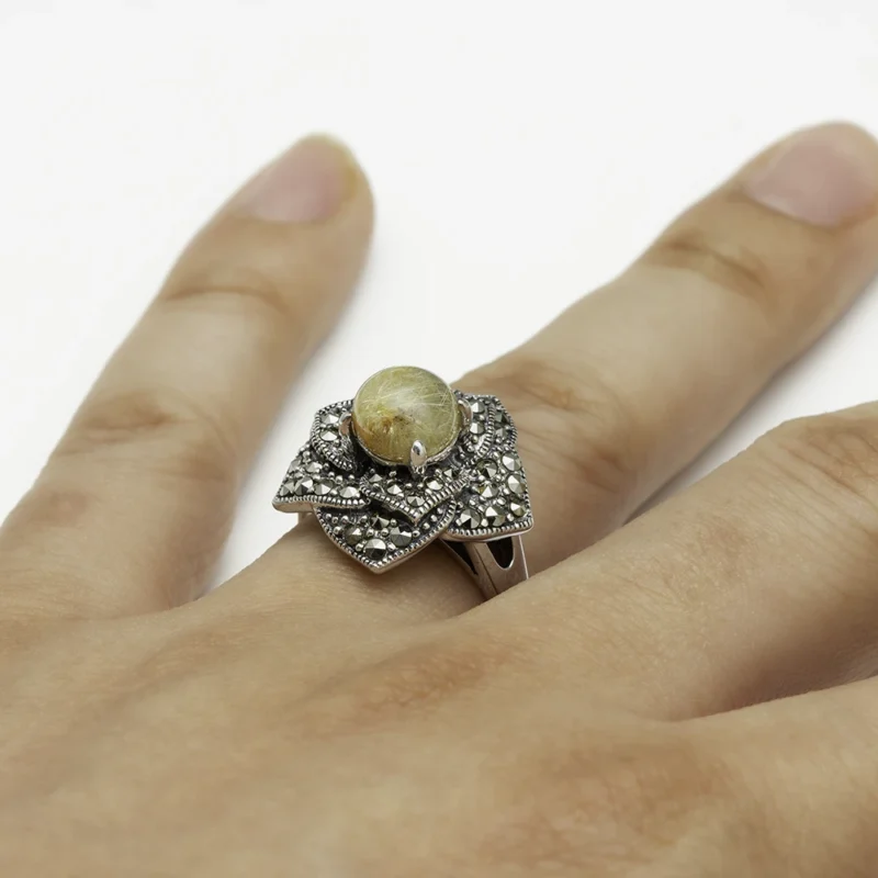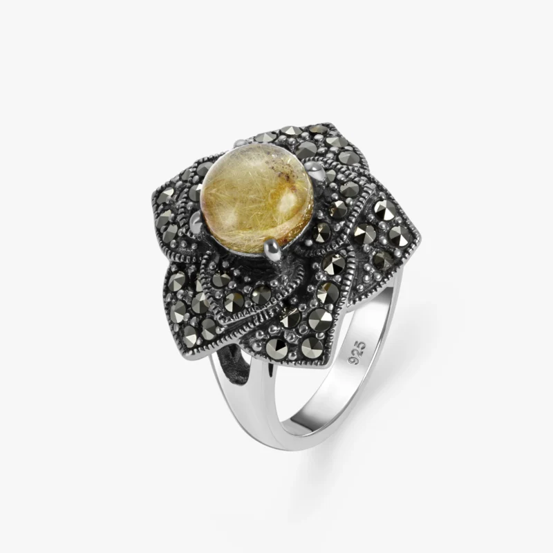 خاتم فضة بحجر كوارتز روتيلي وإطار بتصميم الماركازيت